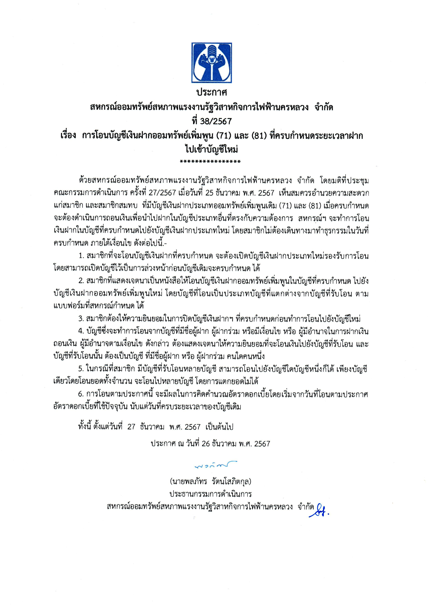 ประกาศที่ 38/2567 เรื่อง การโอนบัญชีเงินฝากออมทรัพย์เพิ่มพูน (71) และ (81) ที่ครบกำหนดระยะเวลาฝาก ไปเข้าบัญชีใหม่