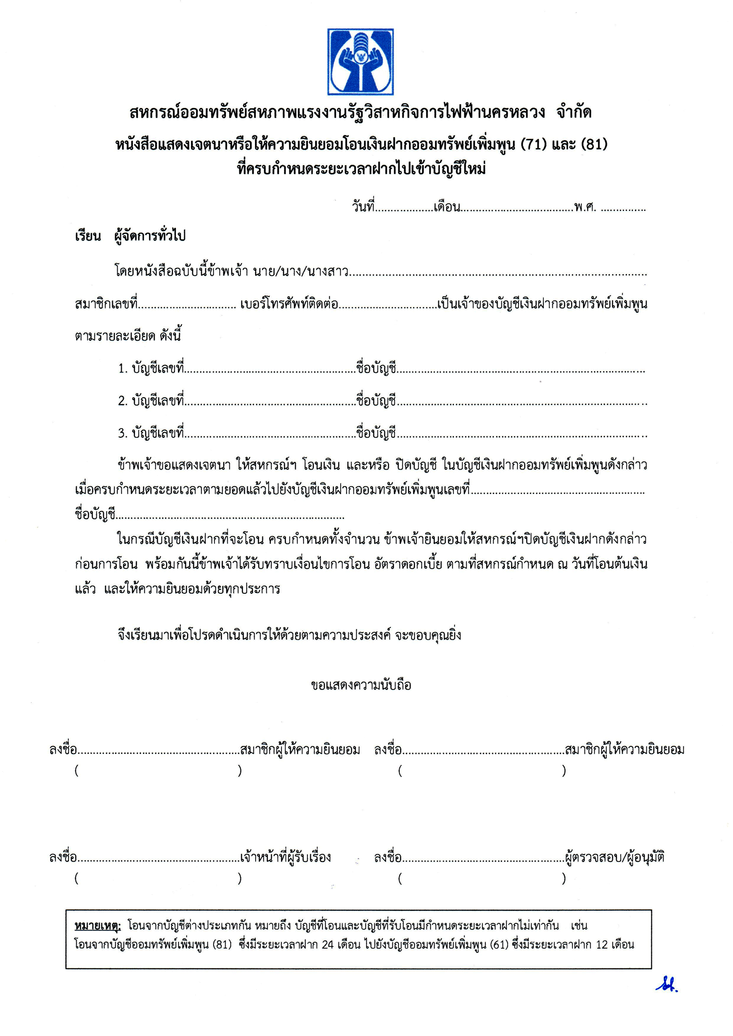 • ประกาศที่ 38/2567 เรื่อง การโอนบัญชีเงินฝากออมทรัพย์เพิ่มพูน (71) และ (81) ที่ครบกำหนดระยะเวลาฝาก ไปเข้าบัญชีใหม่
