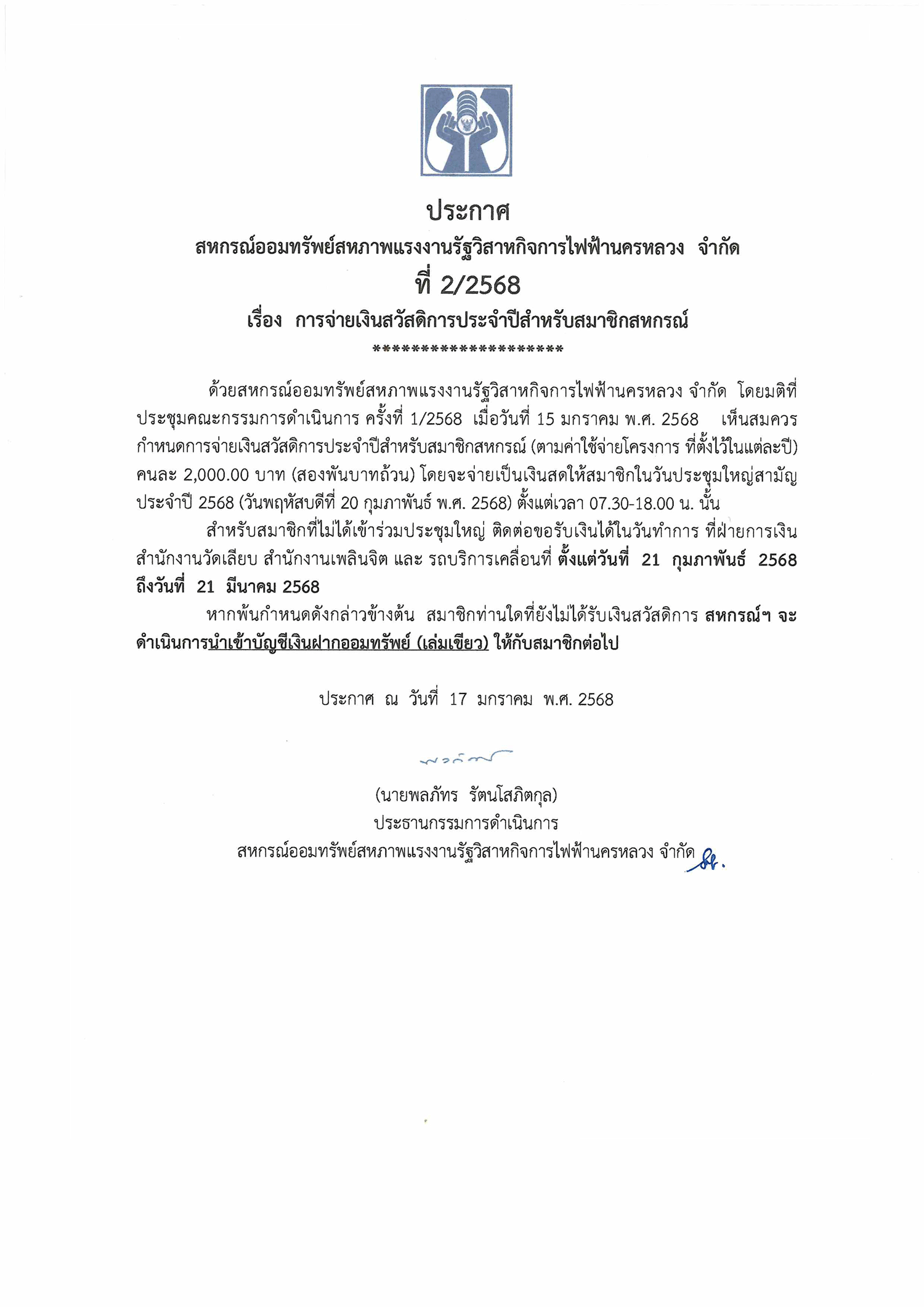 • ประกาศที่ 2/2568 เรื่อง การจ่ายเงินสวัสดิการประจำปีสำหรับสมาชิกสหกรณ์ฯ
