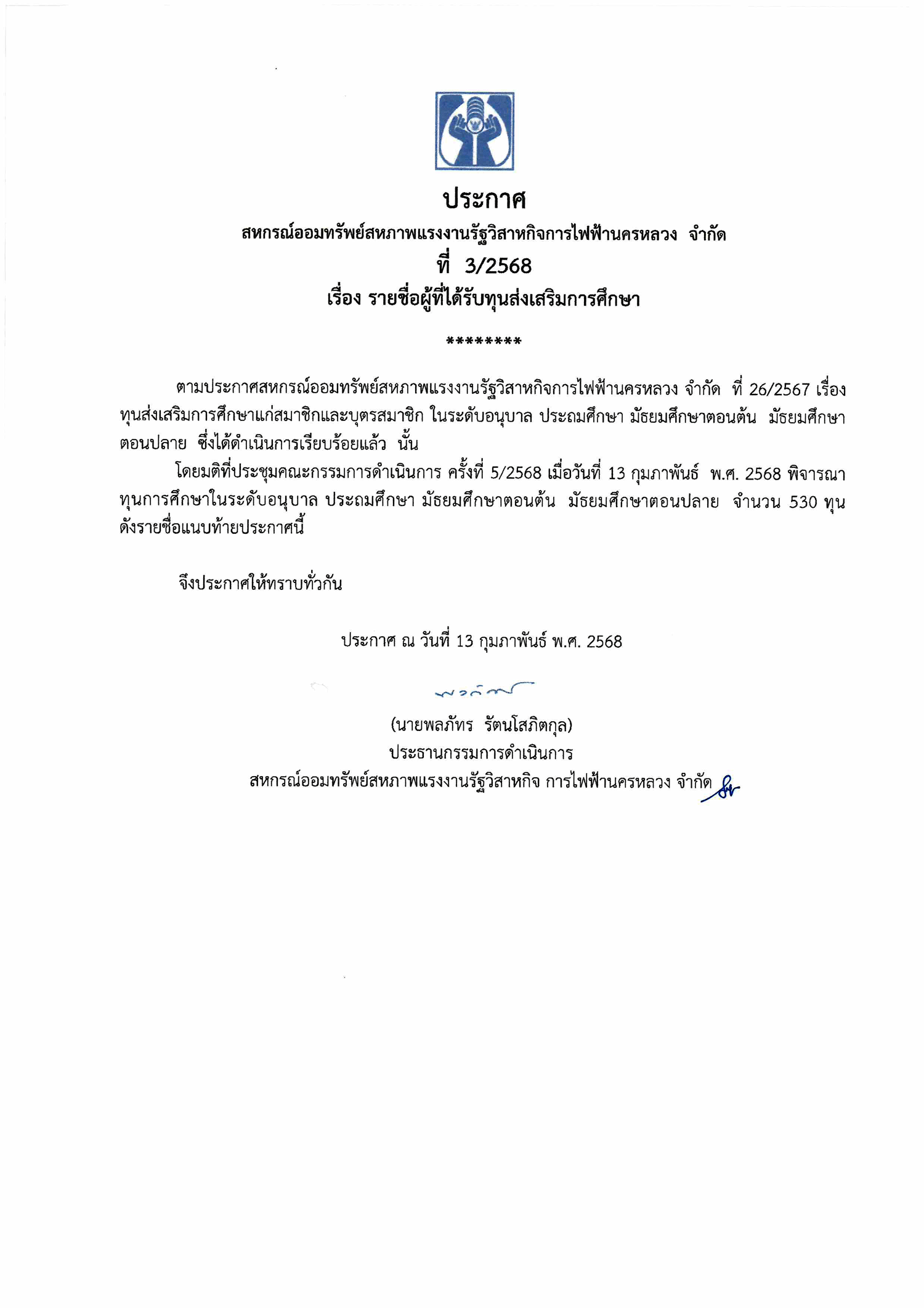 • ประกาศที่ 3/2568 เรื่อง รายชื่อผู้ที่ได้รับทุนส่งเสริมการศึกษา