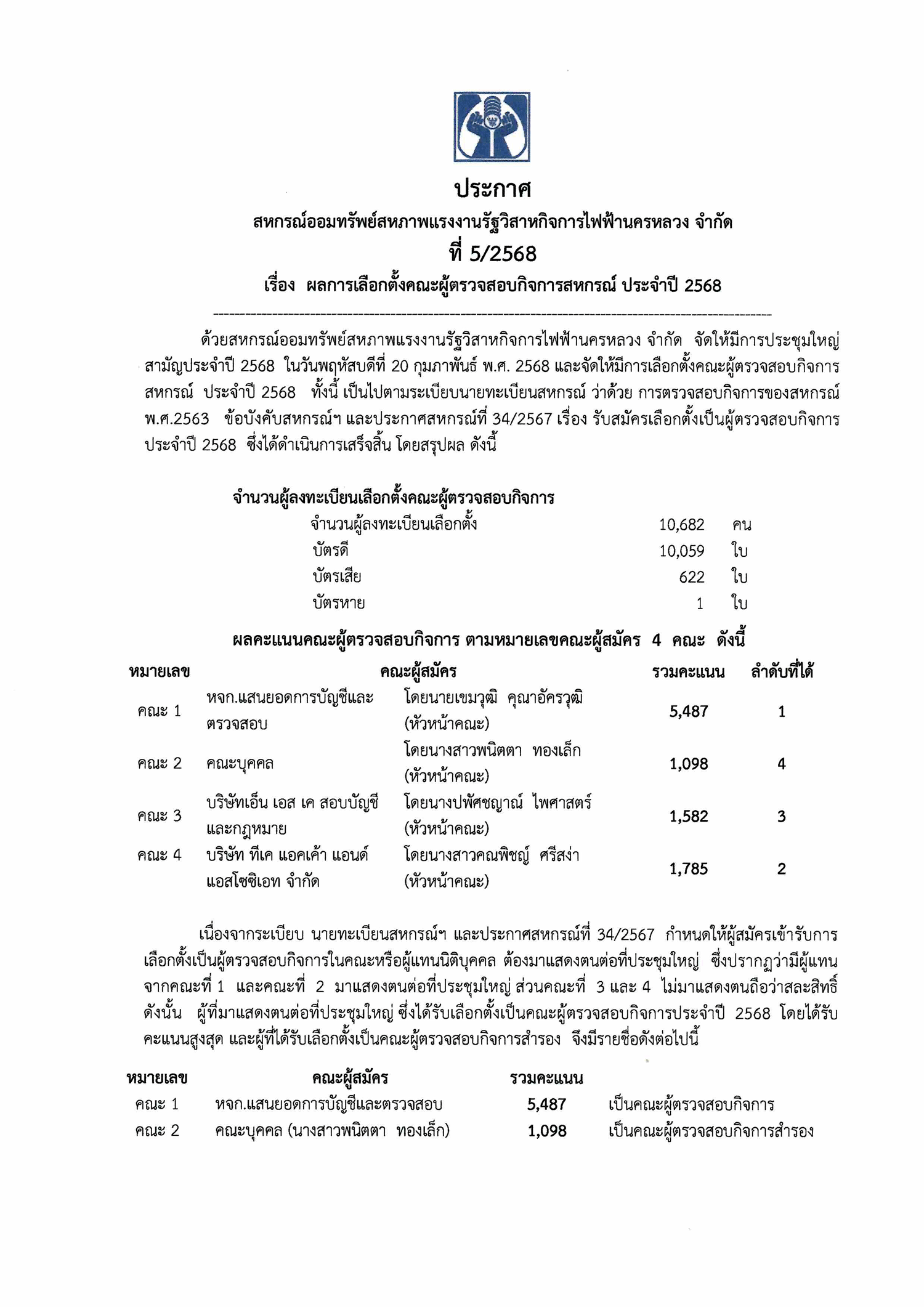 • ประกาศที่ 5/2568 เรื่อง ผลการเลือกตั้งคณะผู้ตรวจสอบกิจการสหกรณ์ ประจำปี 2568