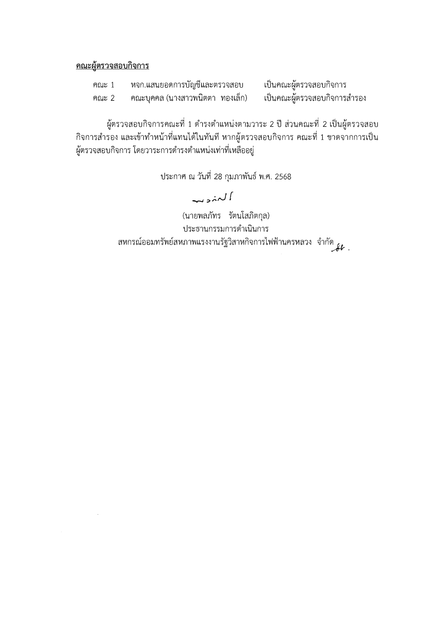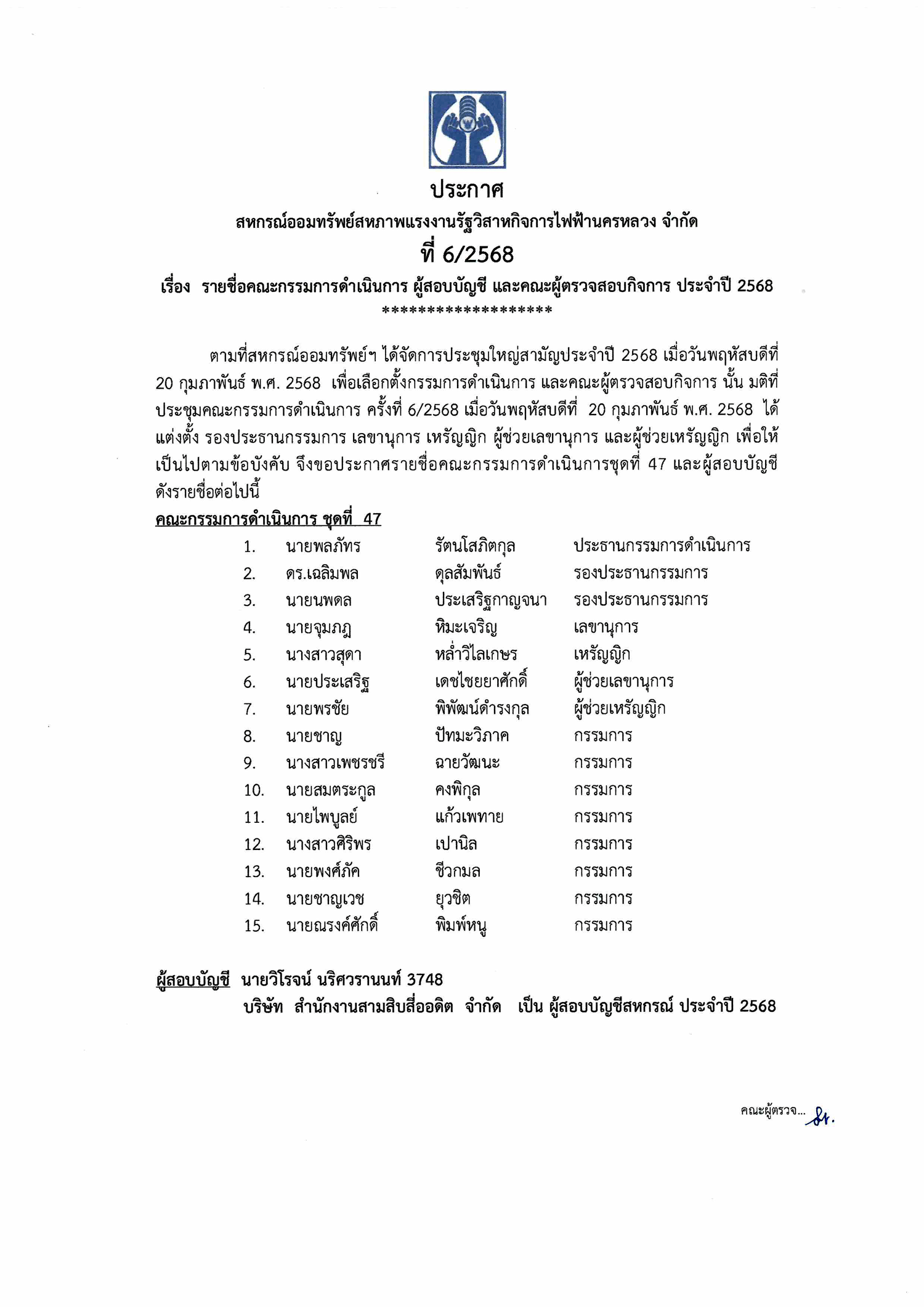• ประกาศที่ 6/2568 เรื่อง รายชื่อคณะกรรมการดำเนินการ ผู้สอบบัญชี และคณะผู้ตรวจสอบกิจการ ประจำปี 2568
