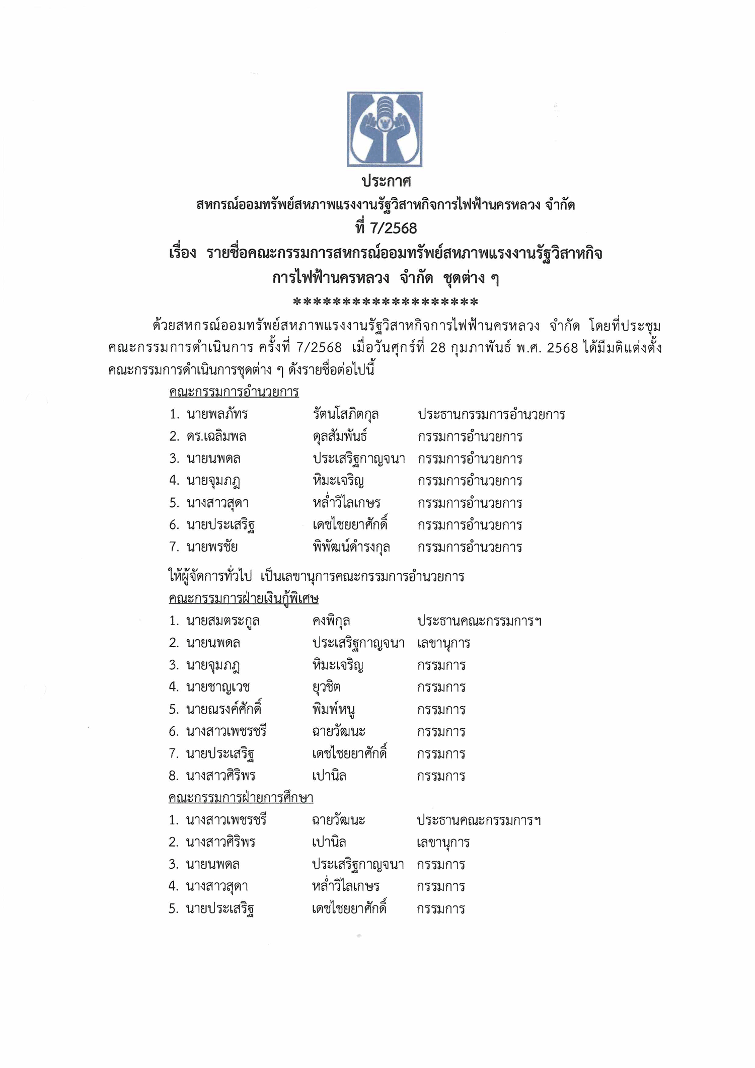 ประกาศที่ 7/2568 เรื่อง รายชื่อคณะกรรมการสหกรณ์ออมทรัพย์สหภาพแรงงานรัฐวิสาหกิจการไฟฟ้านครหลวง จำกัด ชุดต่าง ๆ