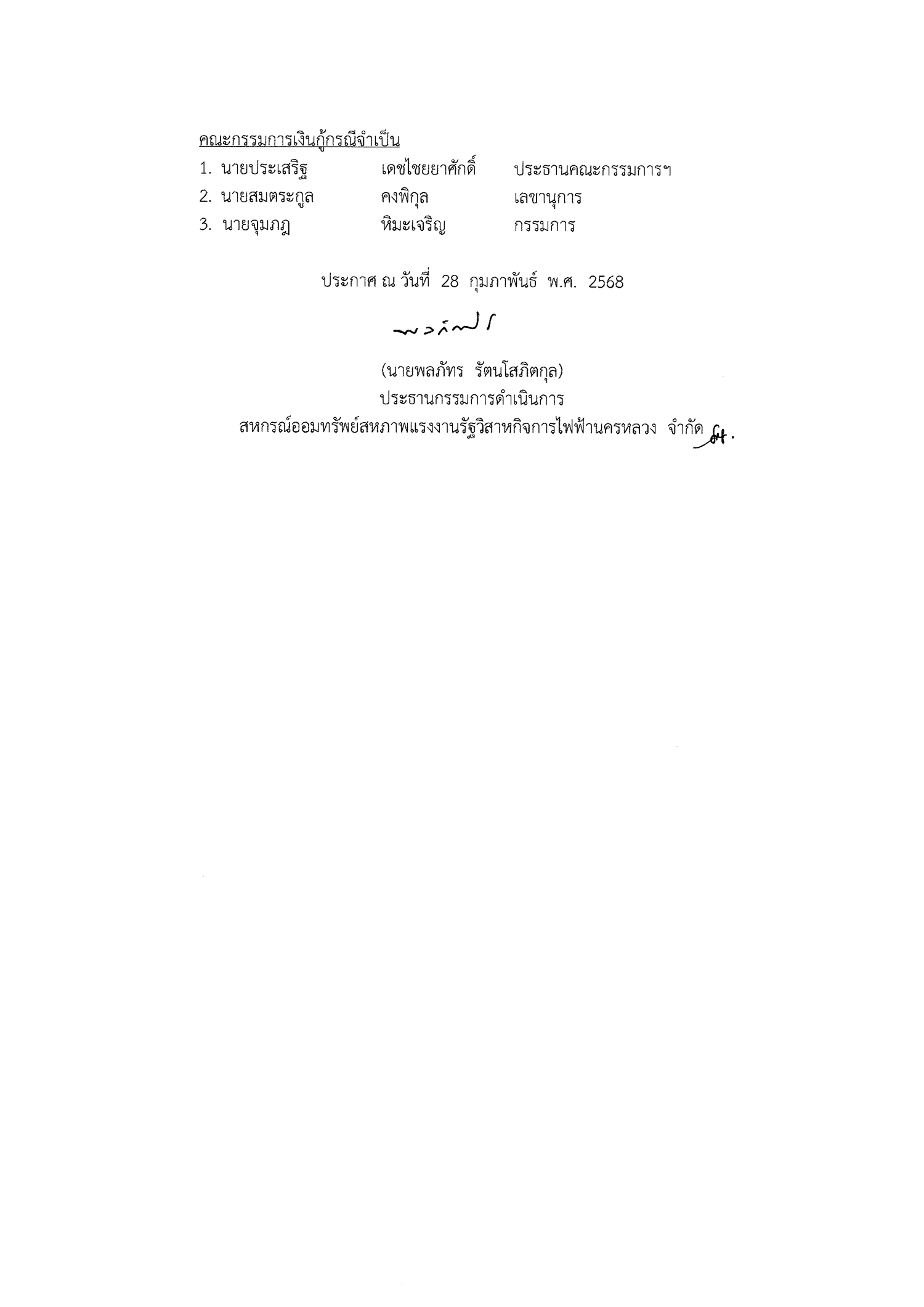 • ประกาศที่ 7/2568 เรื่อง รายชื่อคณะกรรมการสหกรณ์ออมทรัพย์สหภาพแรงงานรัฐวิสาหกิจการไฟฟ้านครหลวง จำกัด ชุดต่าง ๆ