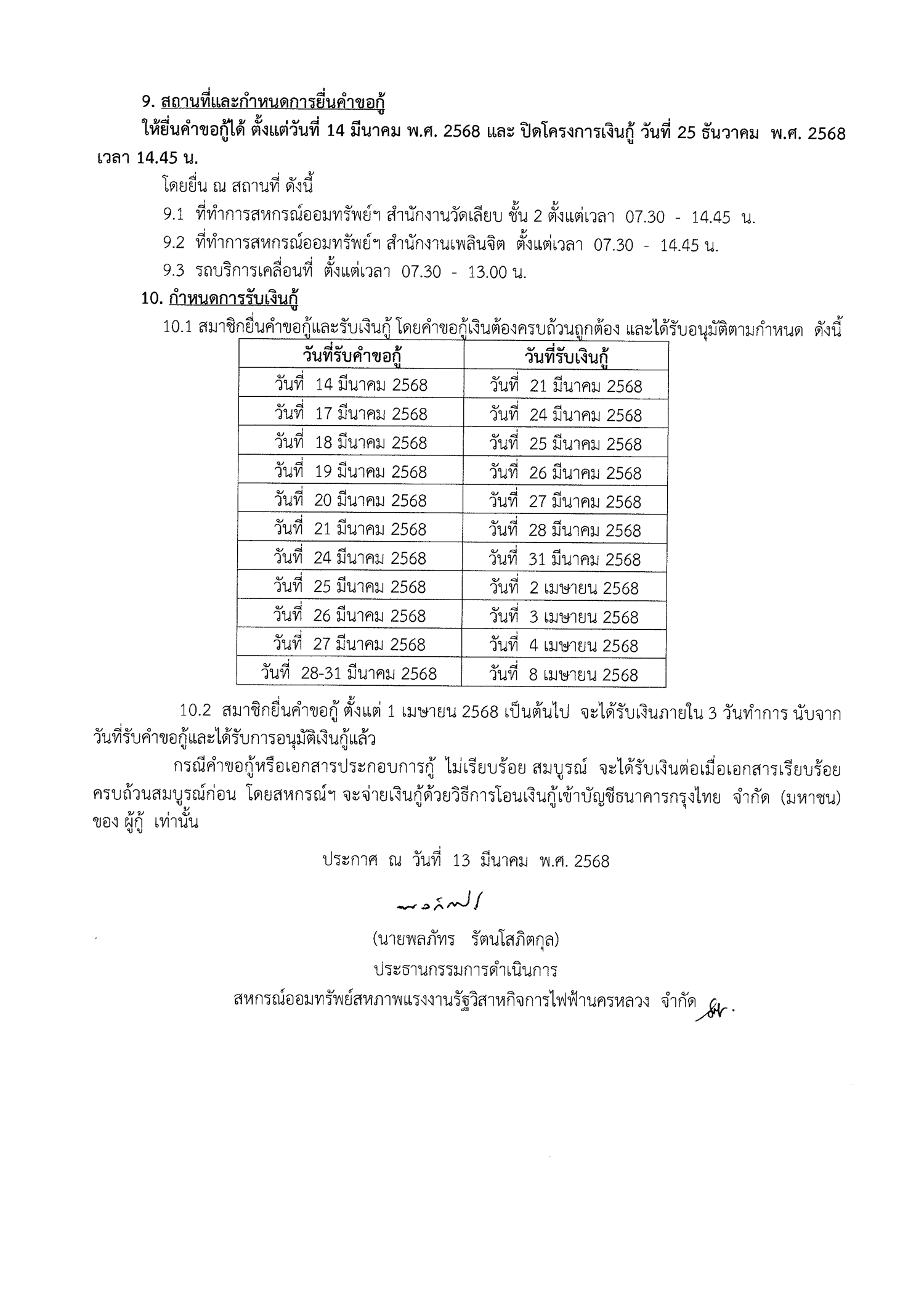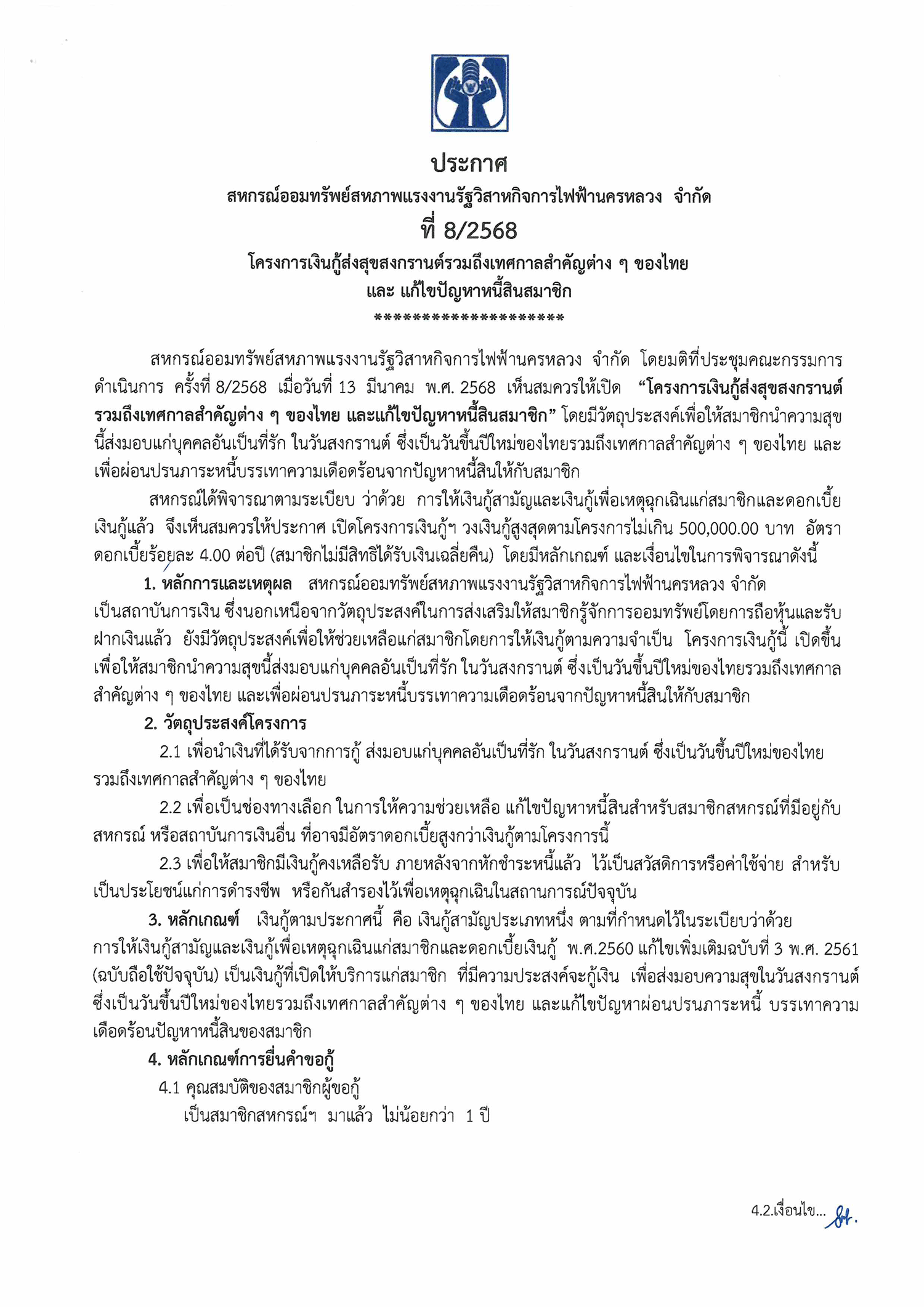 • ประกาศที่ 8/2568 เรื่อง โครงการเงินกู้ส่งสุขสงกรานต์รวมถึงเทศกาลสำคัญต่าง ๆ ของไทยและ แก้ไขปัญหาหนี้สินสมาชิก