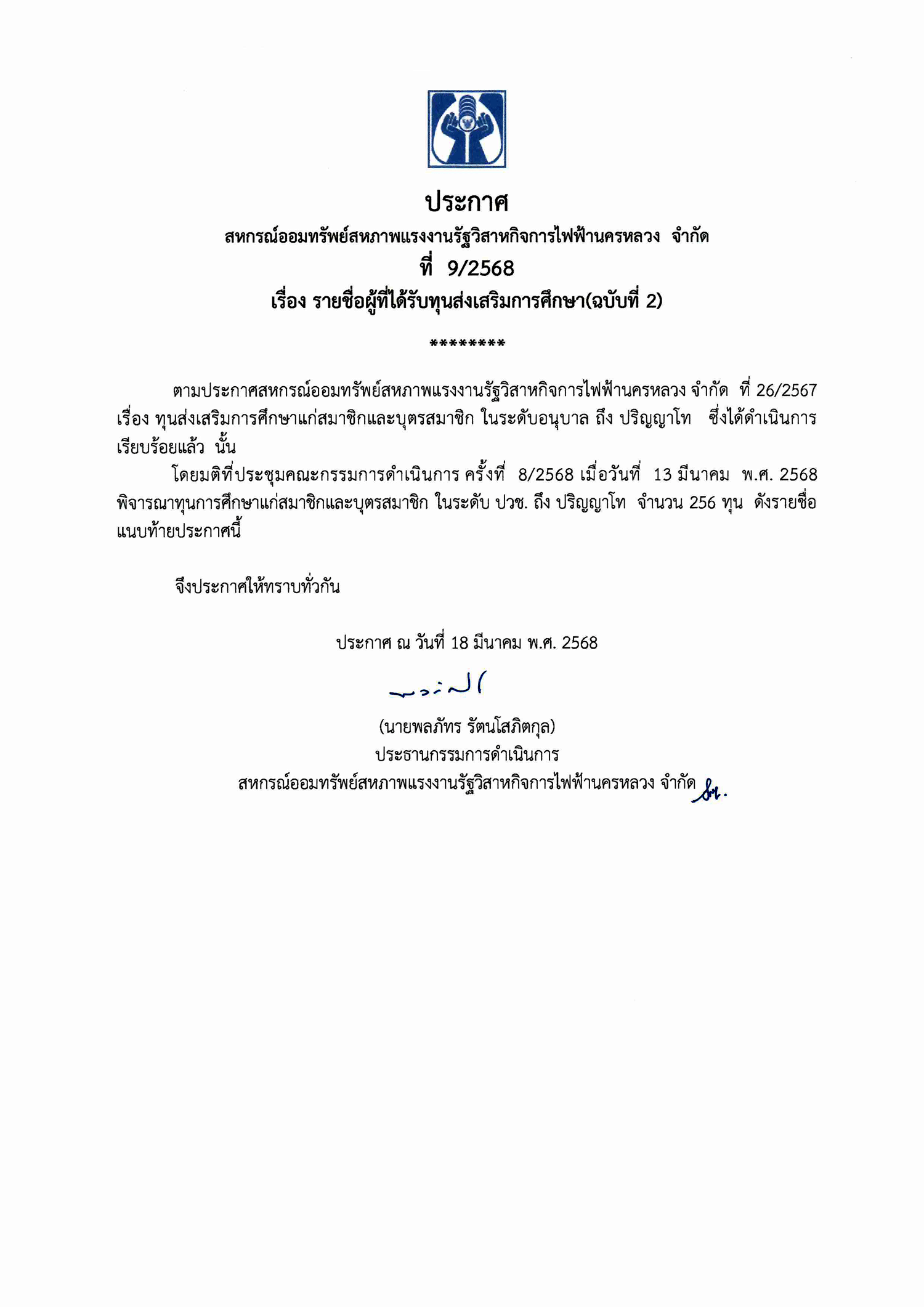 • ประกาศที่ 9/2568 เรื่อง รายชื่อผู้ที่ได้รับทุนส่งเสริมการศึกษา(ฉบับที่ 2)