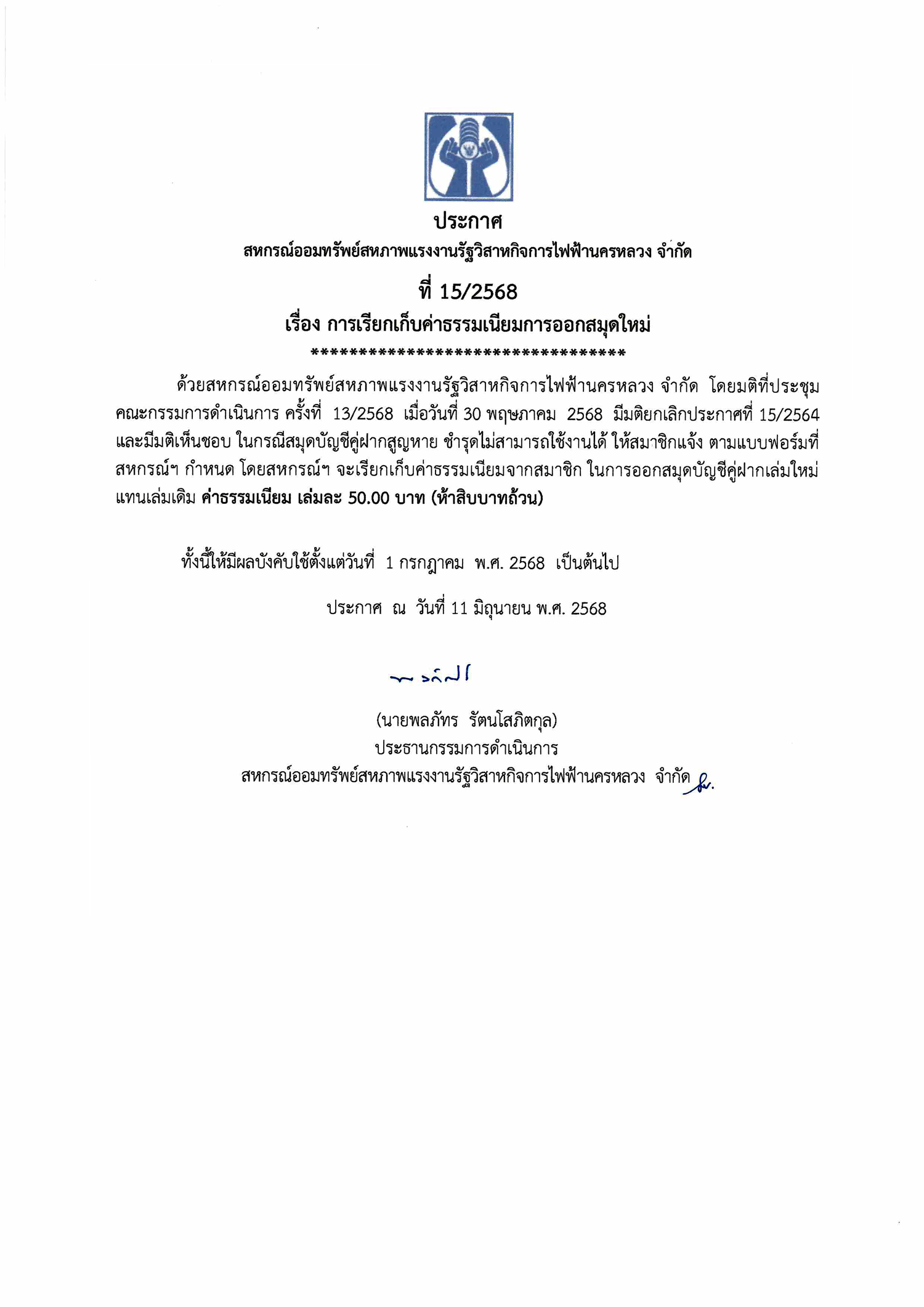 • ประกาศที่ 15/2568 เรื่อง การเรียกเก็บค่าธรรมเนียมการออกสมุดใหม่