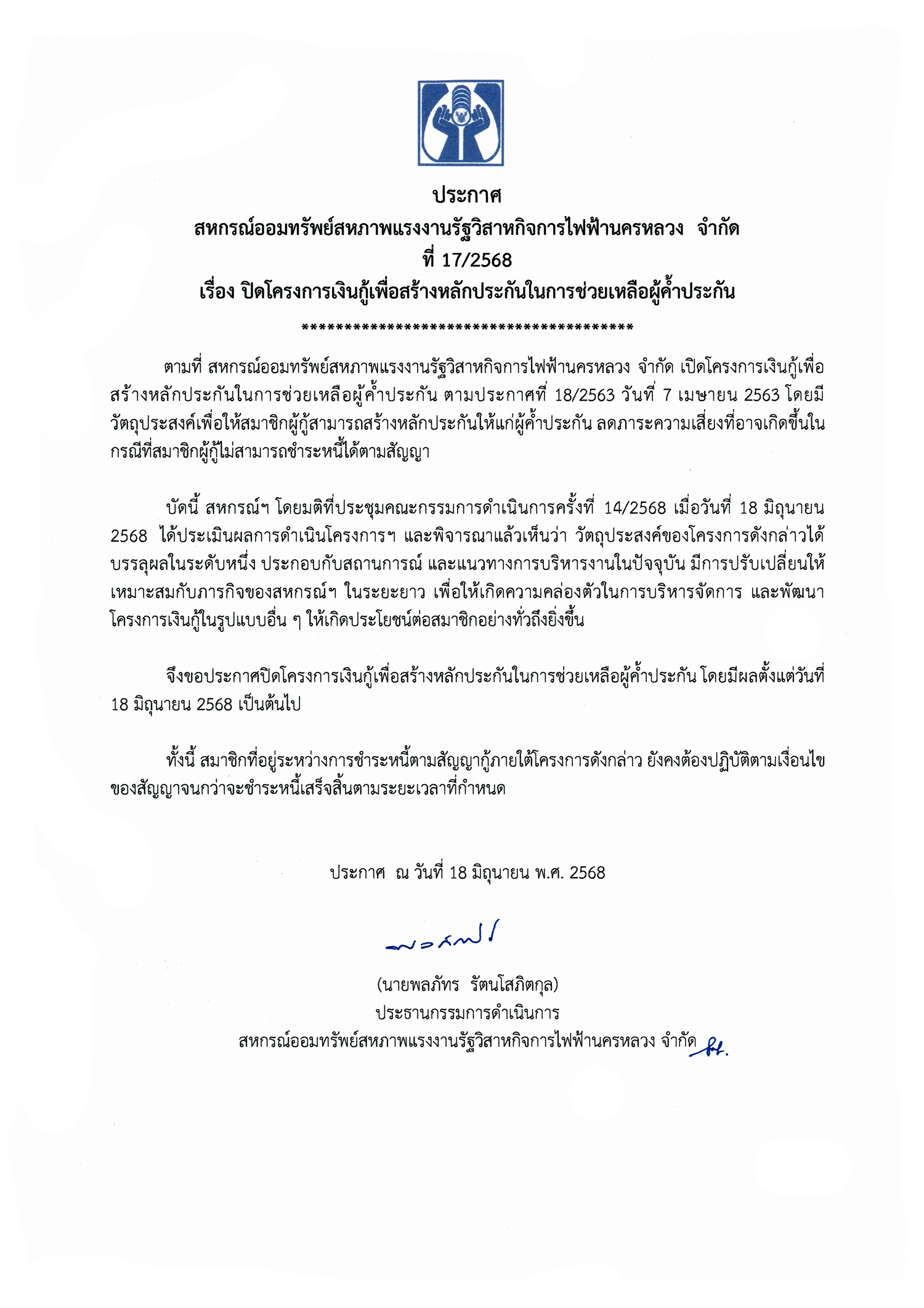 ประกาศที่ 17/2568 เรื่อง ปิดโครงการเงินกู้เพื่อสร้างหลักประกันในการช่วยเหลือผู้ค้ำประกัน