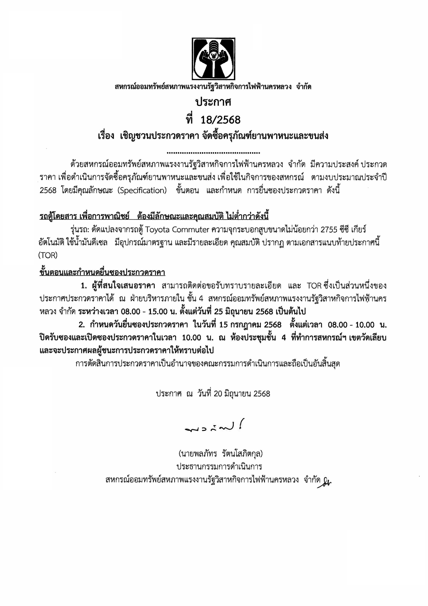 ประกาศที่ 18/2568 เรื่อง เชิญชวนประกวดราคา จัดซื้อครุภัณฑ์ยานพาหนะและขนส่ง