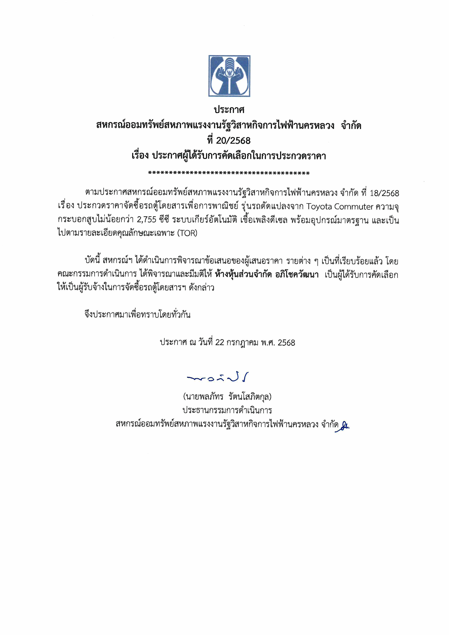 • ประกาศที่ 20/2568 เรื่อง ประกาศผู้ได้รับการคัดเลือกในการประกวดราคา