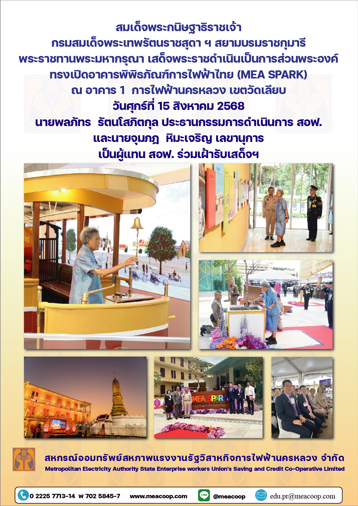 • สมเด็จพระกนิษฐาธิราชเจ้า กรมสมเด็จพระเทพรัตนราชสุดา ฯ สยามบรมราชกุมารี พระราชทานพระมหากรุณา เสด็จพระราชดำเนินเป็นการส่วนพระองค์ ทรงเปิดอาคารพิพิธภัณฑ์การไฟฟ้าไทย (MEA SPARK)