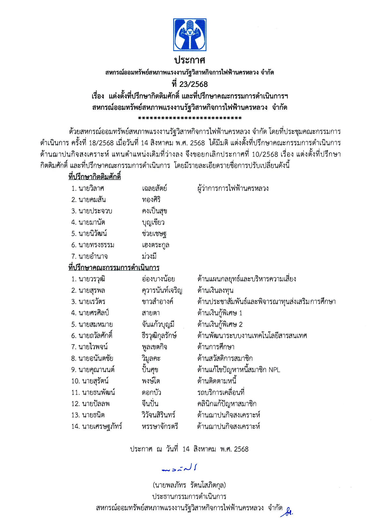 • ประกาศที่ 23/2568 เรื่อง แต่งตั้งที่ปรึกษากิตติมศักดิ์ และที่ปรึกษาคณะกรรมการดำเนินการ สหกรณ์ฯ