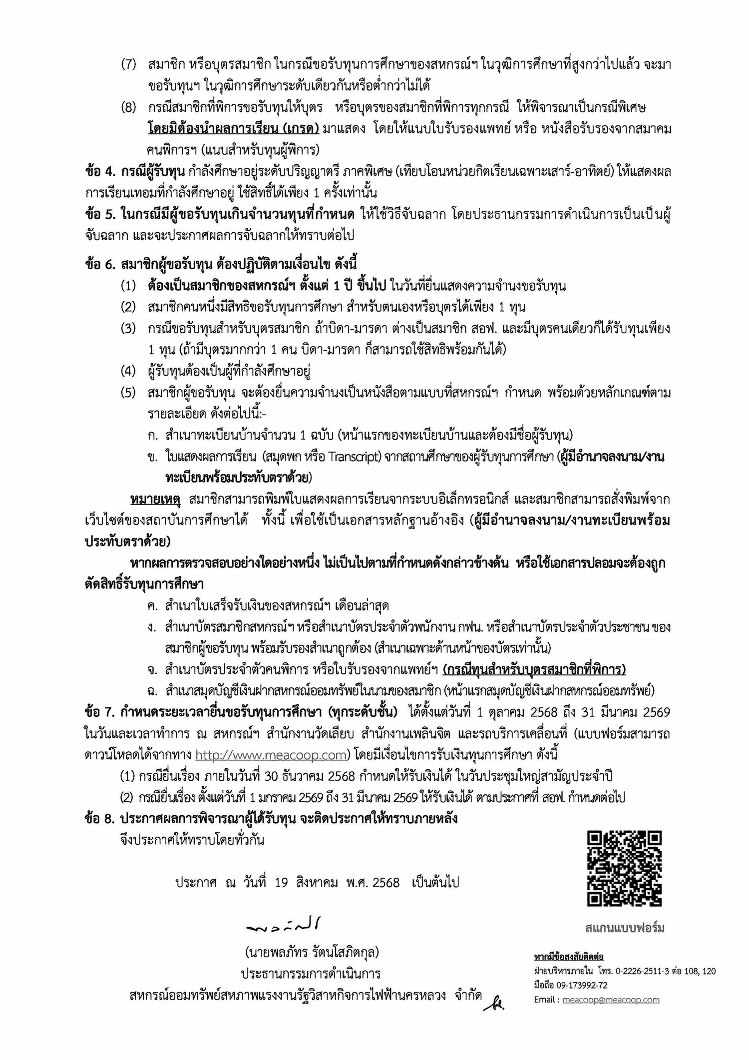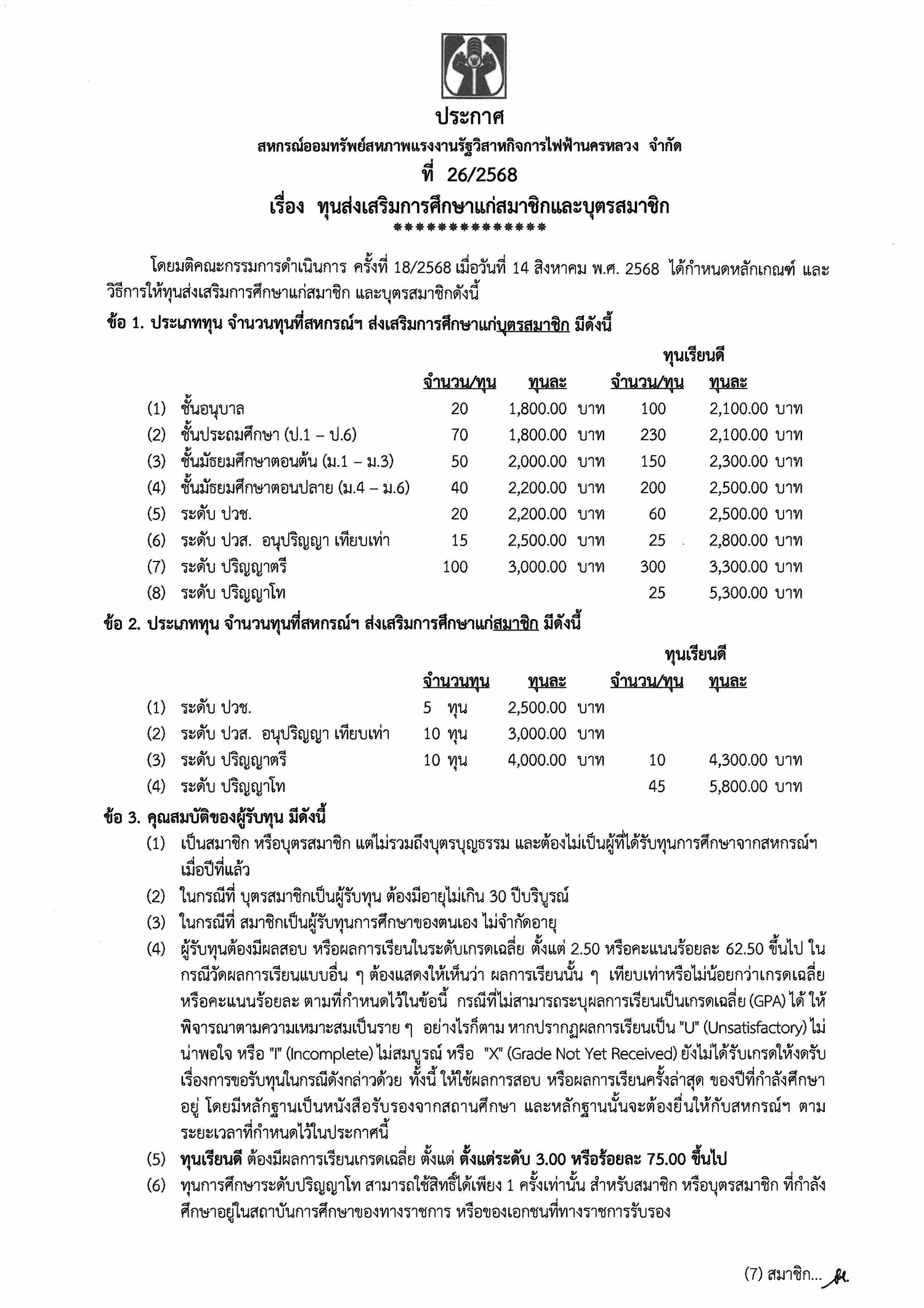 • ประกาศที่ 26/2568 เรื่อง ทุนส่งเสริมการศึกษาแก่สมาชิกและบุตรสมาชิก