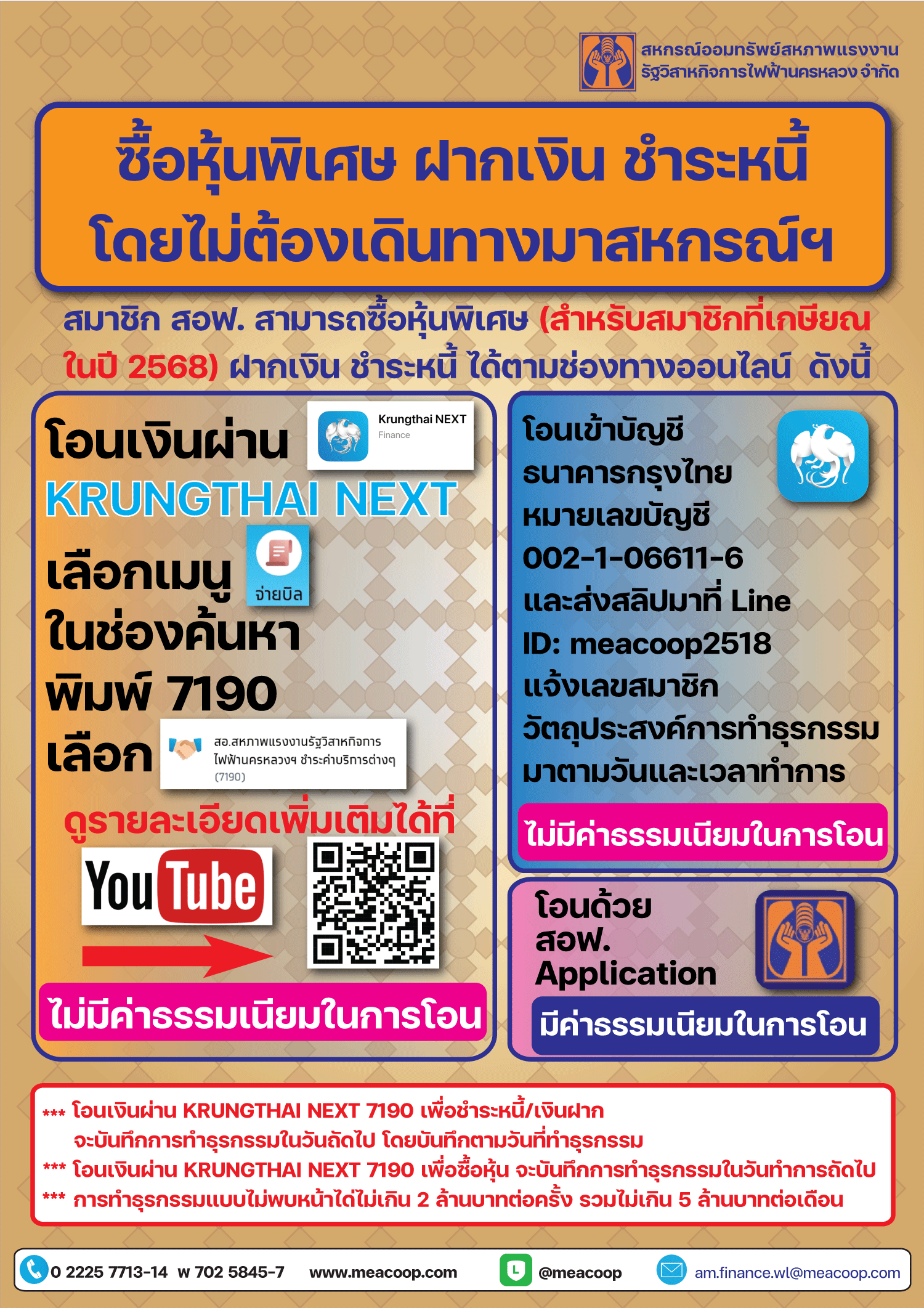 การซื้อหุ้นพิเศษ ฝากเงิน ชำระหนี้ โดยไม่ต้องเดินทางมาสหกรณ์ฯ