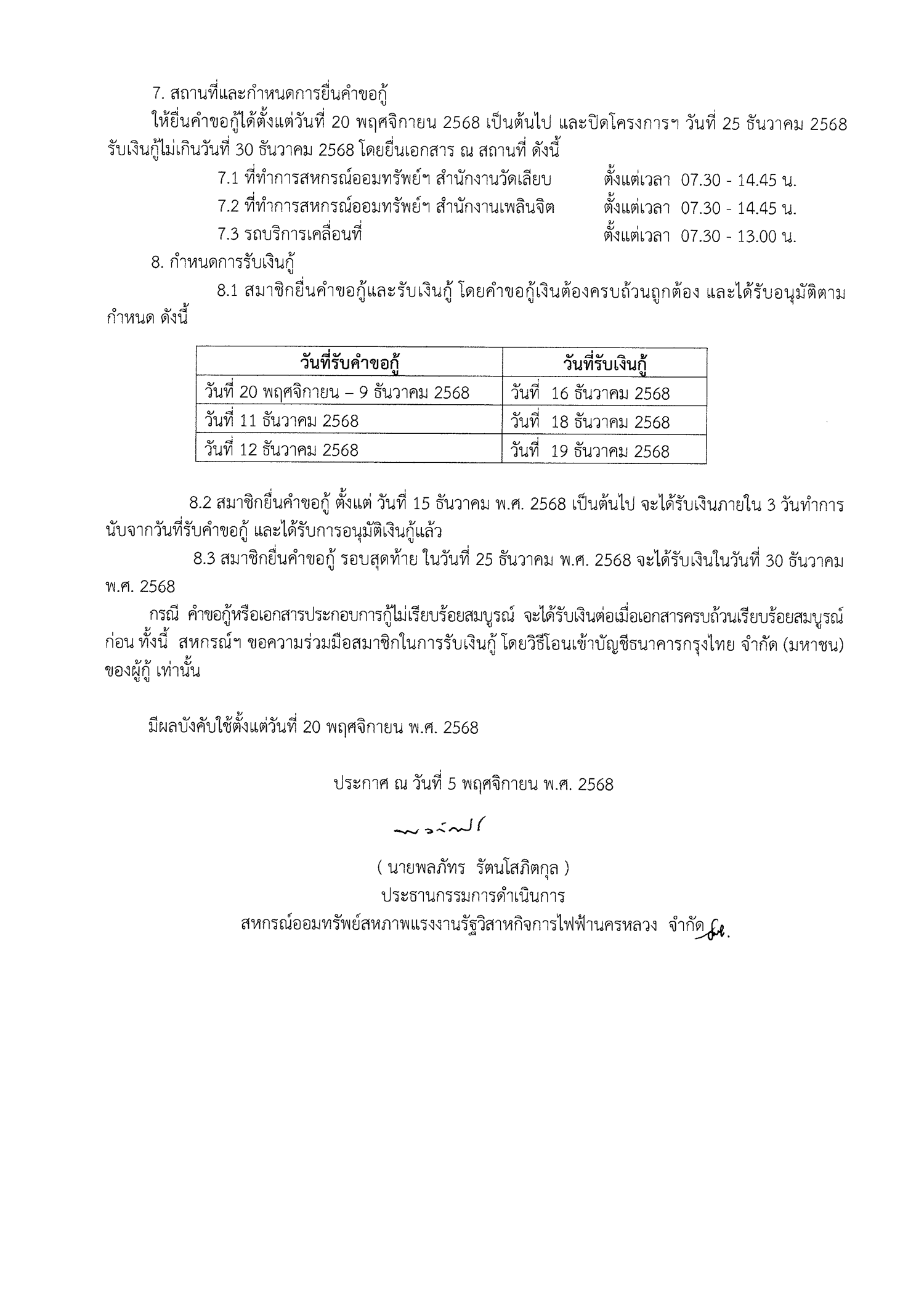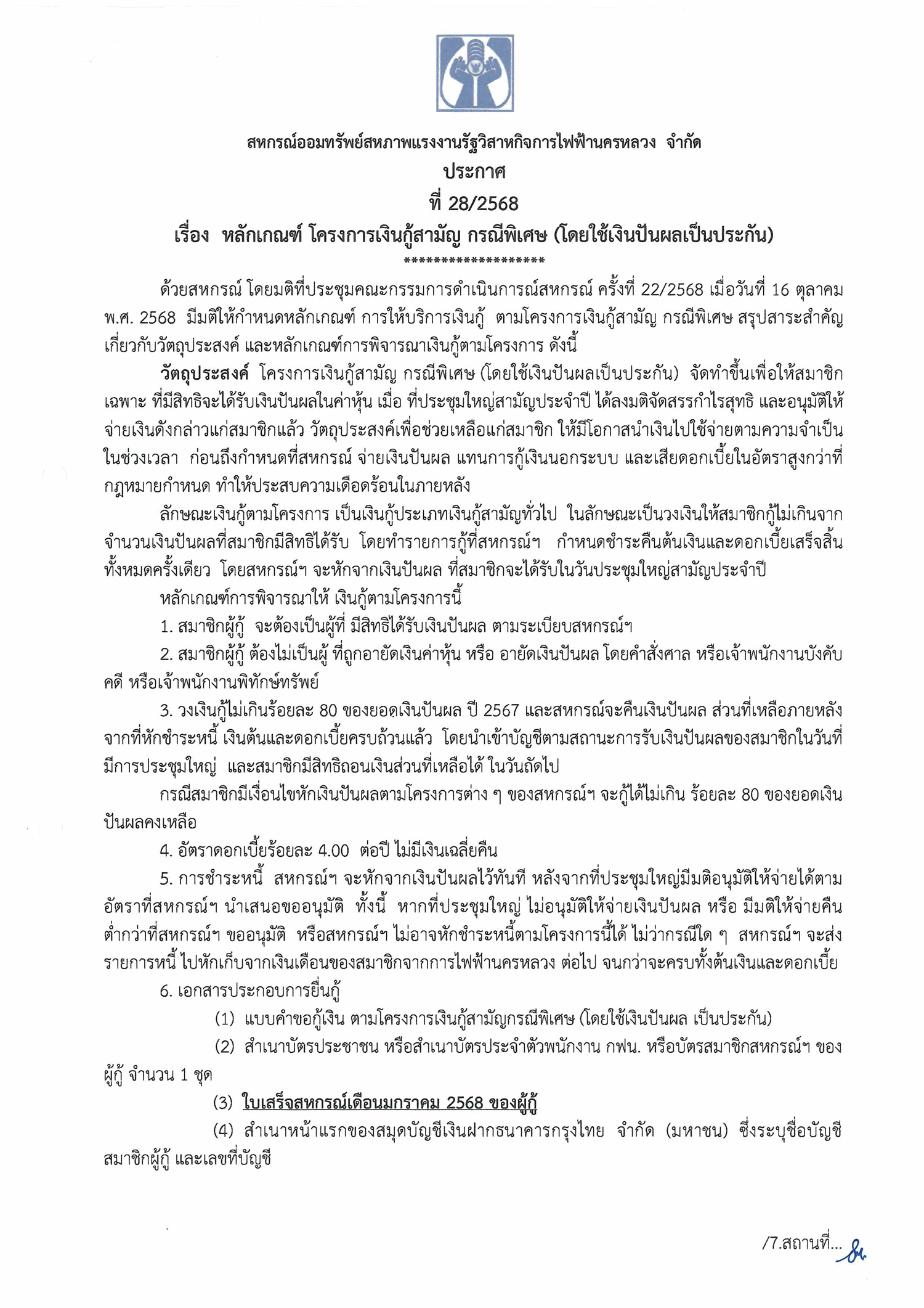 • ประกาศที่ 28/2568 เรื่อง หลักเกณฑ์ โครงการเงินกู้สามัญ กรณีพิเศษ (โดยใช้เงินปันผลเป็นประกัน)