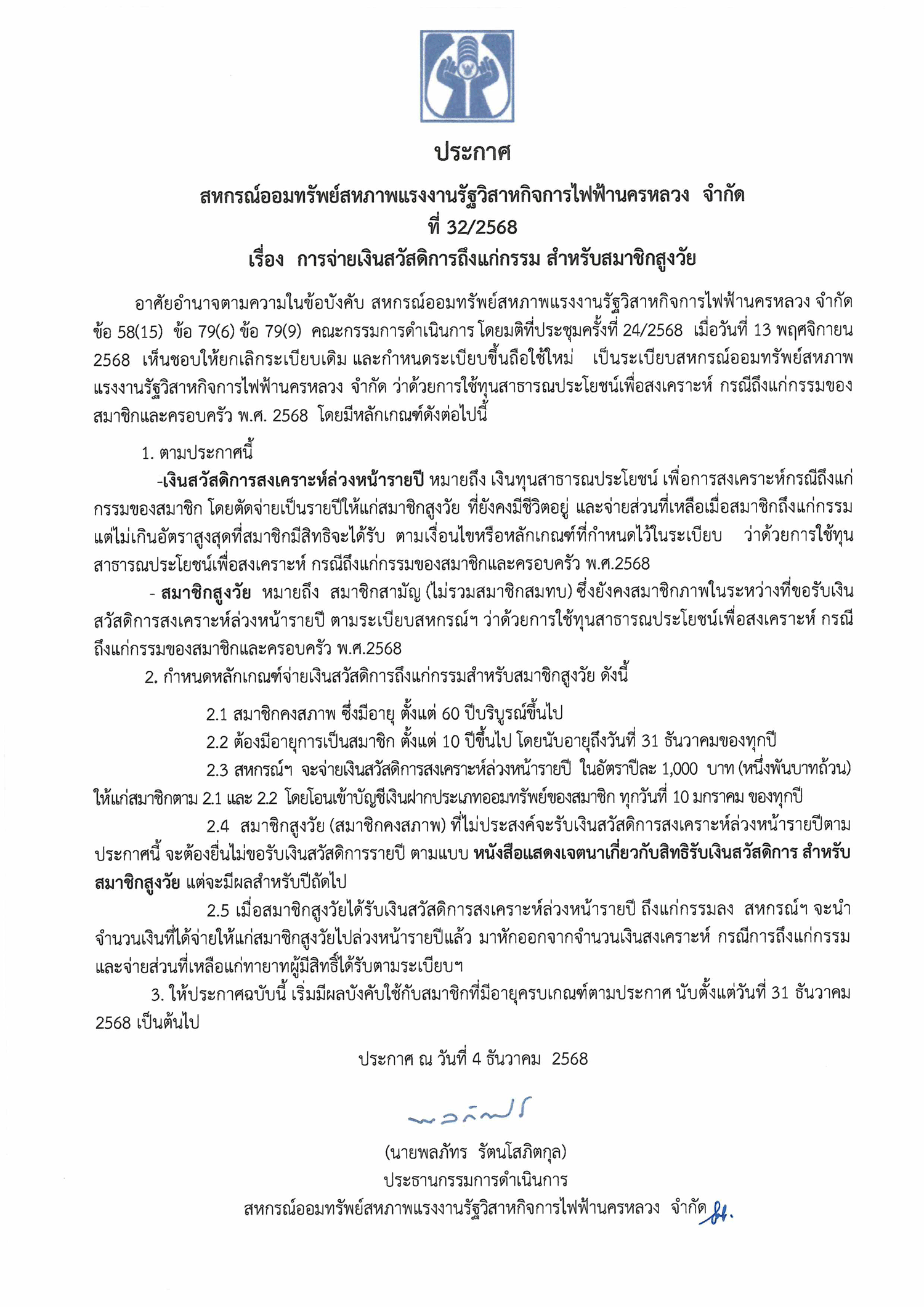 • ประกาศที่ 32/2568 เรื่อง การจ่ายเงินสวัสดิการถึงแก่กรรม สำหรับสมาชิกสูงวัย