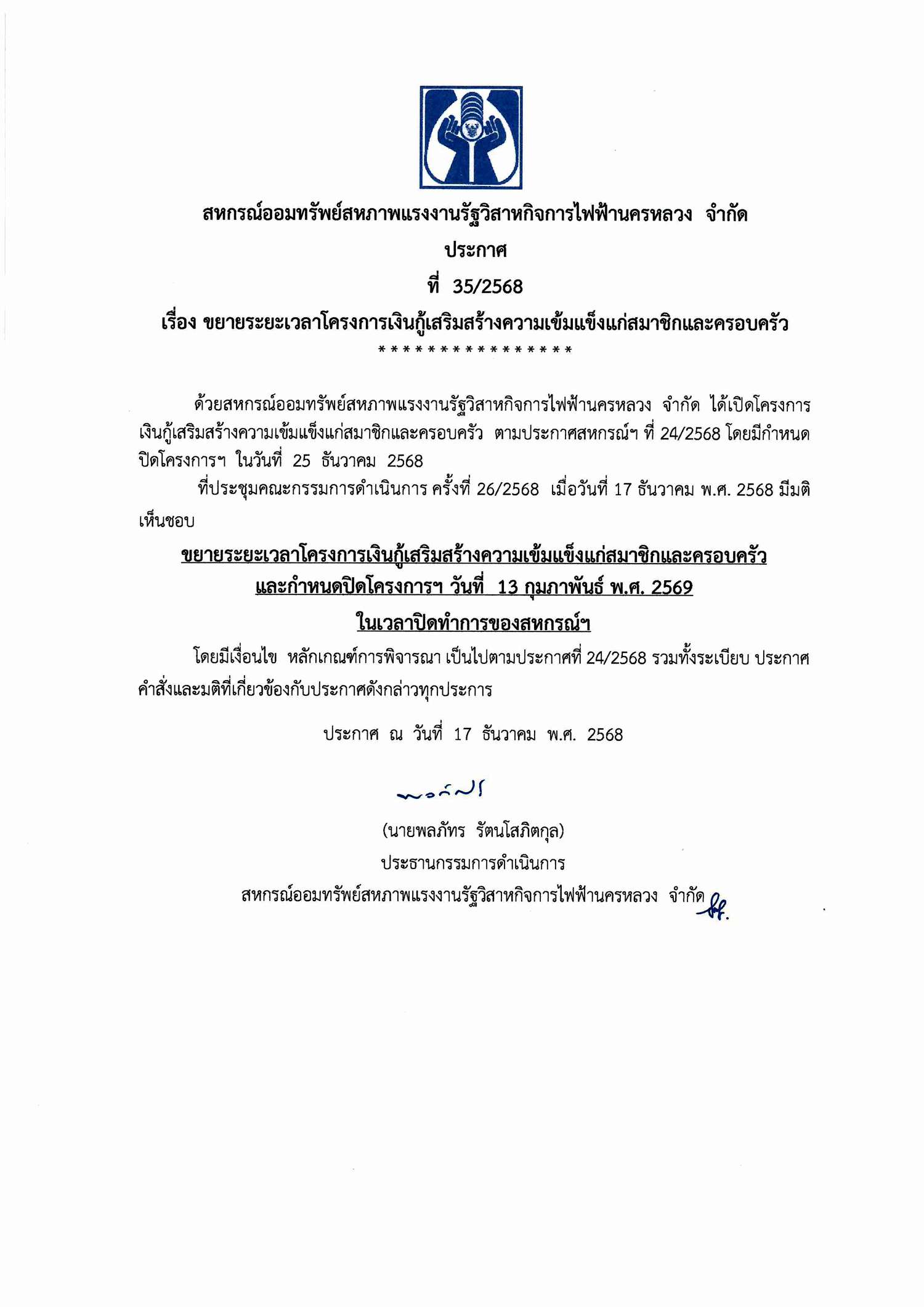 ประกาศที่ 35/2568 เรื่อง ขยายระยะเวลาโครงการเงินกู้เสริมสร้างความเข้มแข็งแก่สมาชิกและครอบครัว