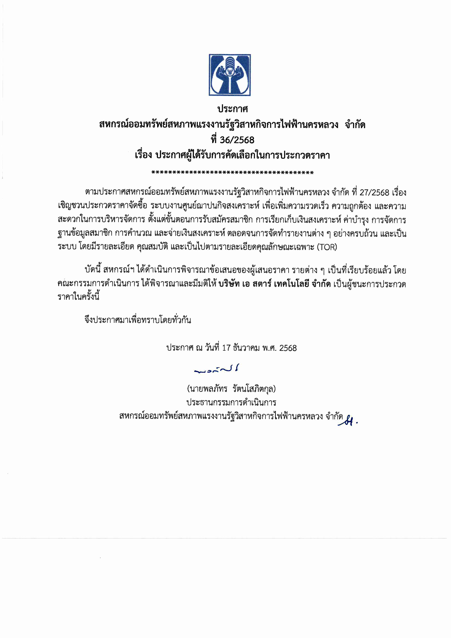 • ประกาศที่ 36/2568 เรื่อง ประกาศผู้ได้รับการคัดเลือกในการประกวดราคา