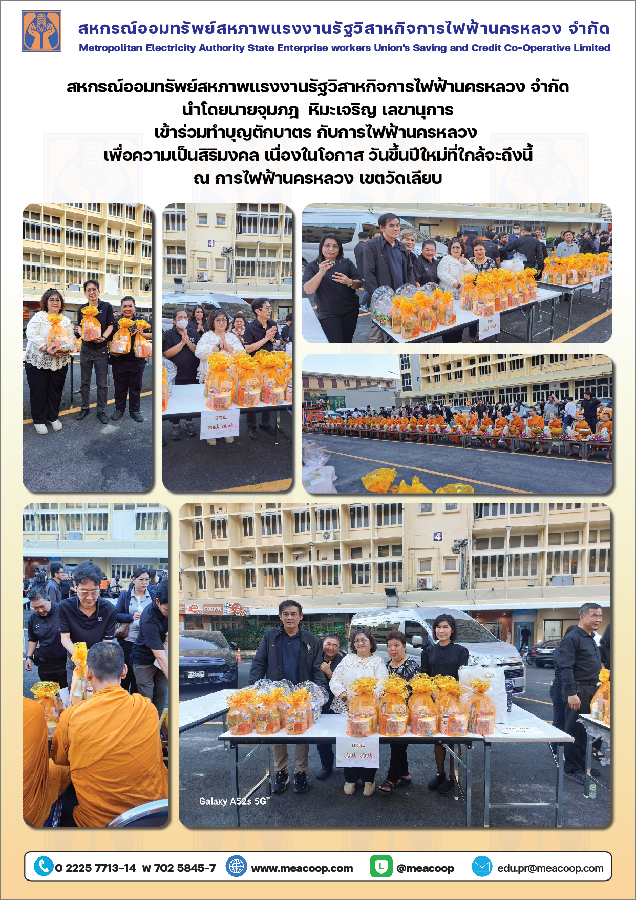 • สอฟ. นำโดยนายจุมภฎ หิมะเจริญ เลขานุการ เข้าร่วมทำบุญตักบาตร กับการไฟฟ้านครหลวง เพื่อความเป็นสิริมงคล เนื่องในโอกาส วันขึ้นปีใหม่