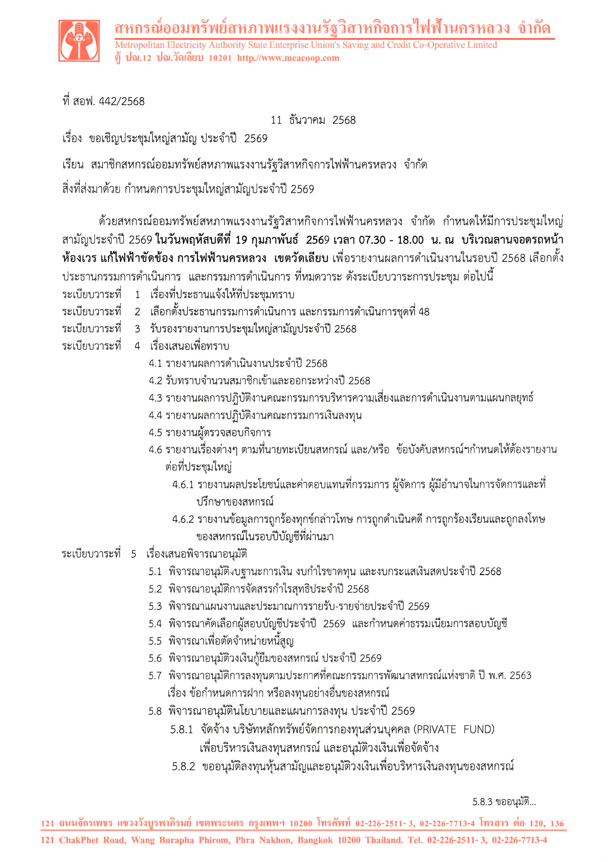 • ขอเชิญสมาชิกร่วมงานประชุมใหญ่สามัญประจำปี 2569 วันพฤหัสบดีที่ 19 กุมภาพันธ์ 2569