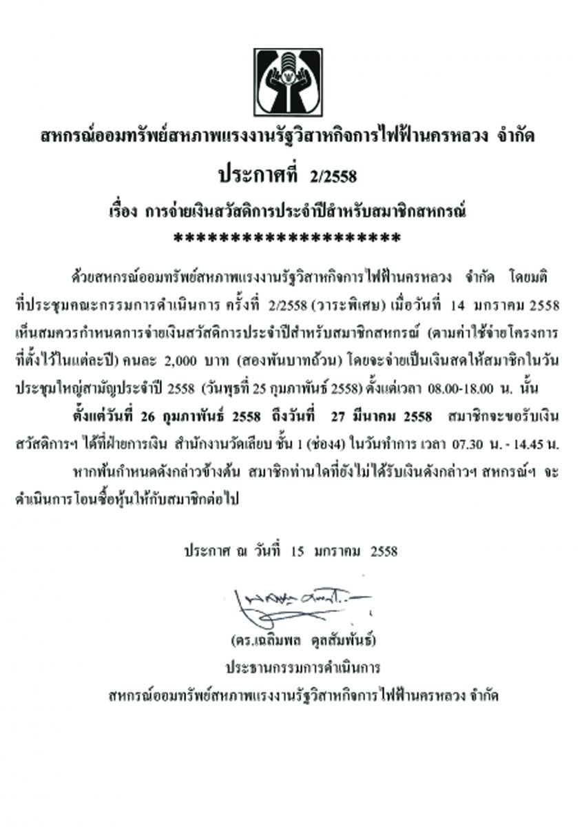 • ประกาศที่ 2/2558 เรื่อง การจ่ายเงินสวัสดิการสำหรับสมาชิกสหกรณ์