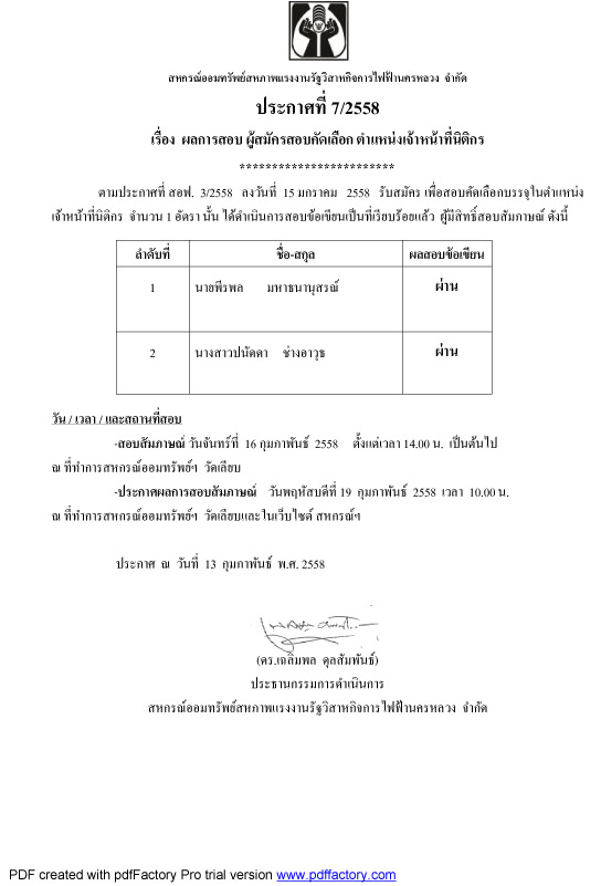 ประกาศที่ 7/2558 เรื่อง ผลการสอบ ผู้สมัครสอบคักเลือก ตำแหน่งเจ้าหน้าที่นิติกร