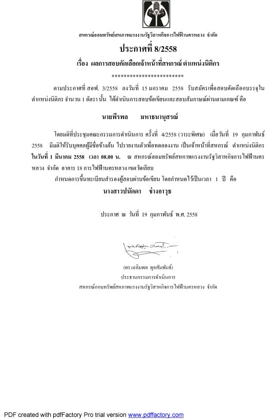 • ประกาศที่ 8/2558 เรื่องผลการสอบคัดเลือกเจ้าหน้าที่สหกรณ์ ตำแหน่งนิติกร