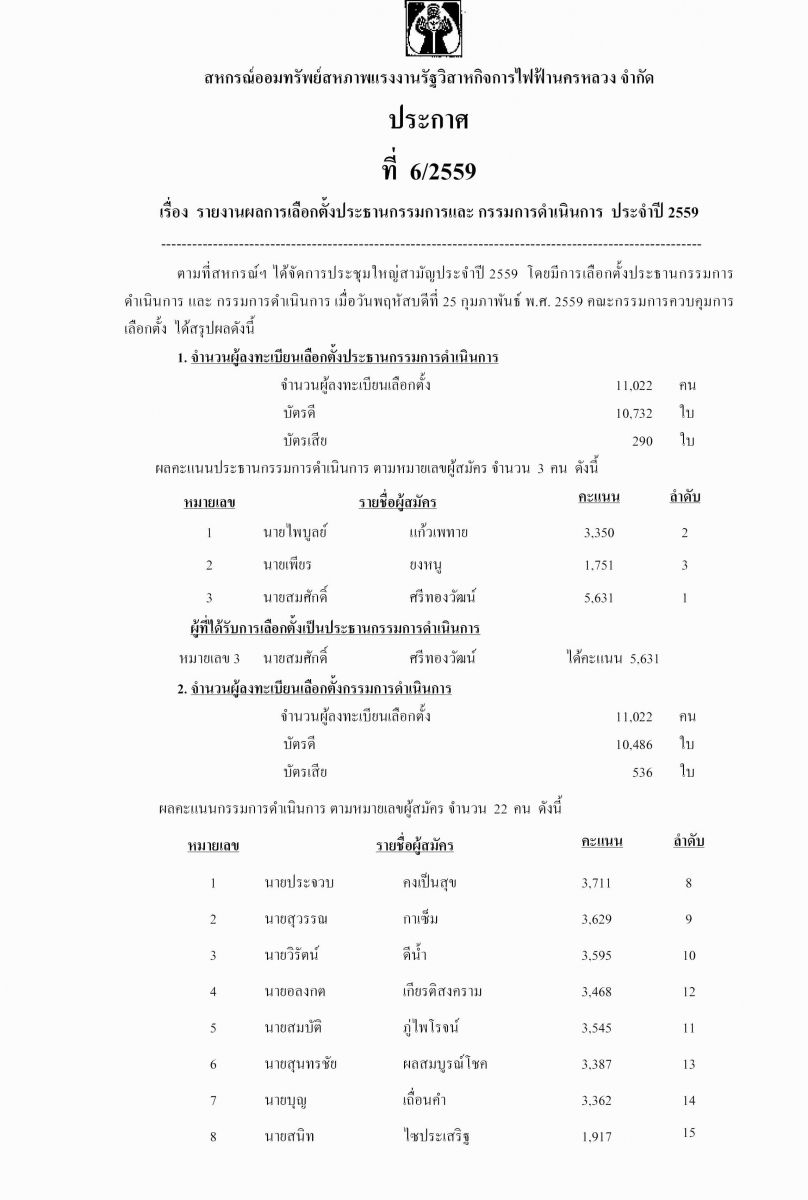 ประกาศที่ 6/2559 เรื่อง รายงานผลการเลือกตั้งประธาน และกรรมการดำเนินการ ประจำปี 2559