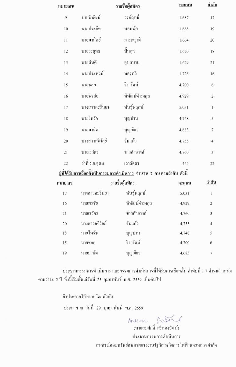 • ประกาศที่ 6/2559 เรื่อง รายงานผลการเลือกตั้งประธาน และกรรมการดำเนินการ ประจำปี 2559