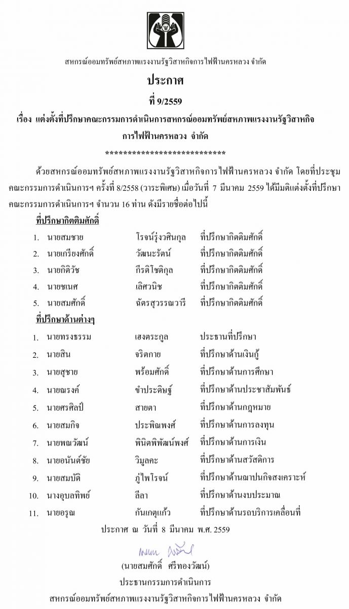 • ประกาศที่ 9/2559 เรื่อง แต่งตั้งที่ปรึกษาคณะกรรมการดำเนินการสหกรณ์ออมทรัพย์ฯ
