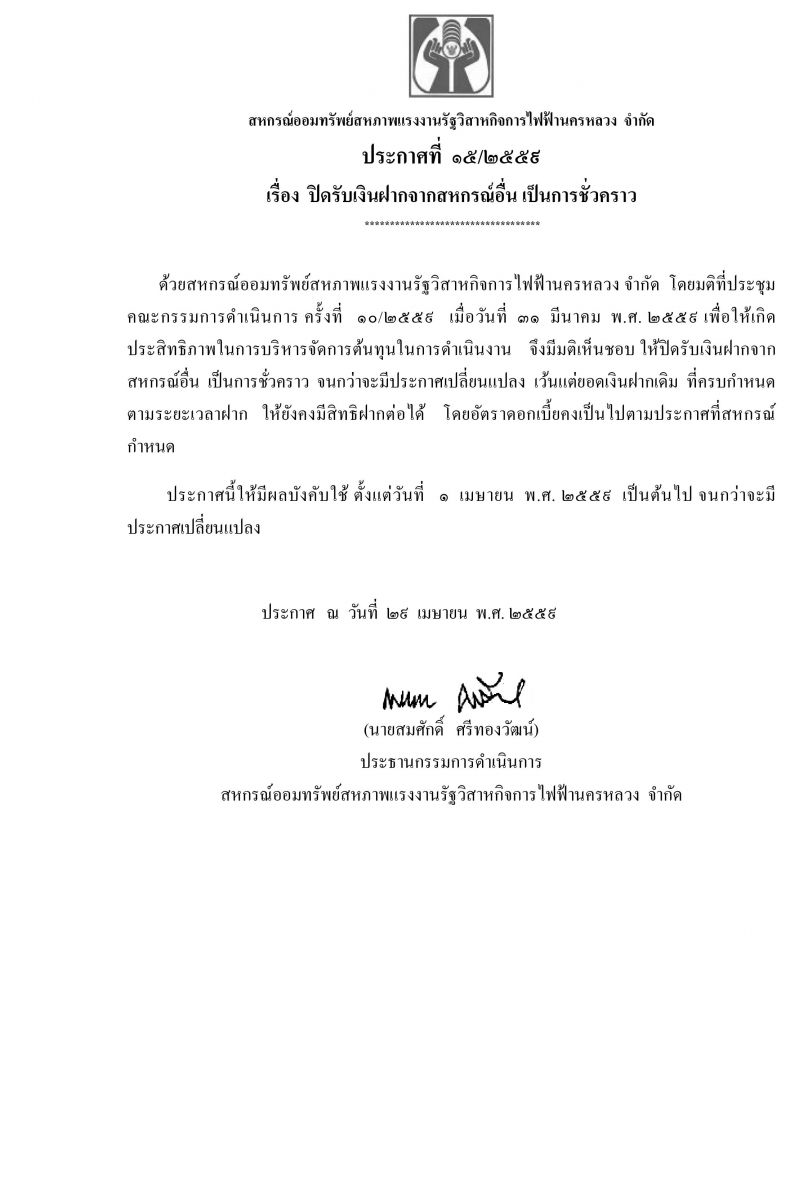 • ประกาศที่ 15/2559 เรื่อง ปิดรับเงินฝากจากสหกรณ์อื่น เป็นการชั่วคราว
