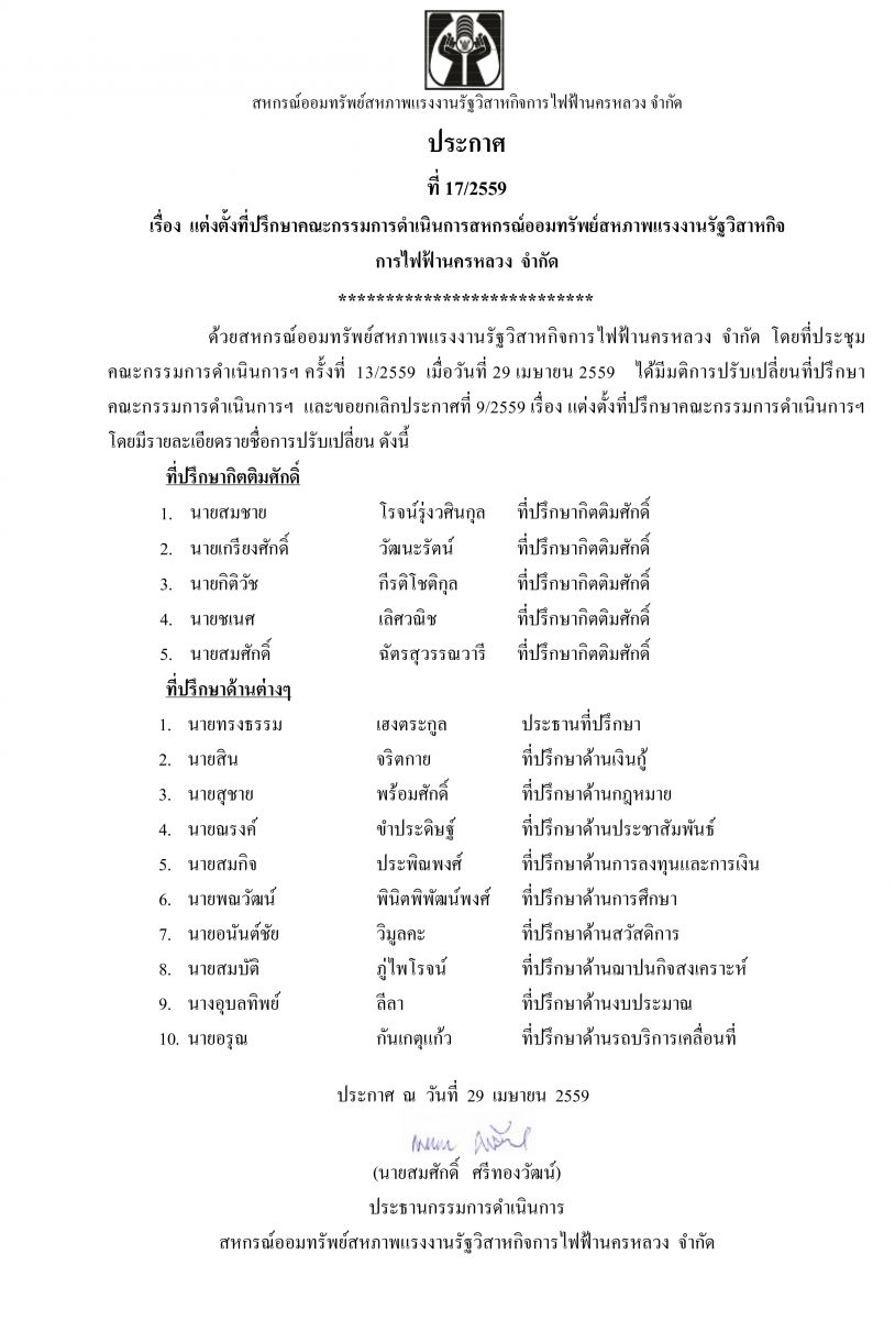 ประกาศที่ 17/2559 เรื่องแต่งตั้งที่ปรึกษาคณะกรรมการดำเนินการ สหกรณ์ออมทรัพย์ฯ
