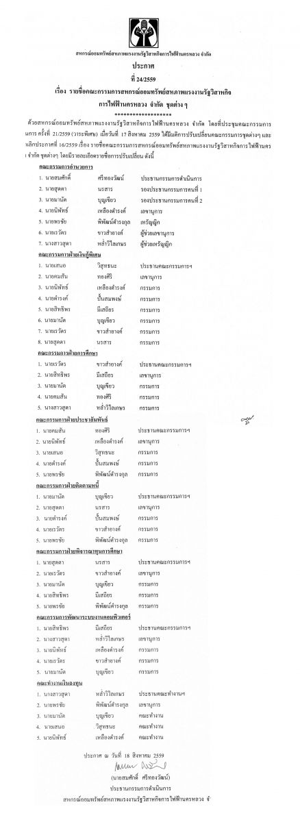 ประกาศที่ 24/2559 เรื่อง รายชื่อคณะกรรมการสหกรณ์ออมทรัพย์ฯ ชุดต่างๆ