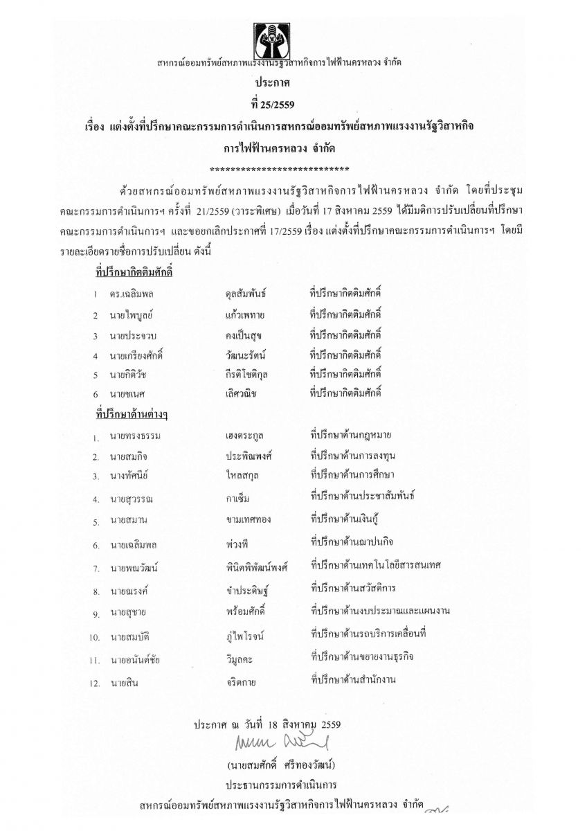 ประกาศที่ 25/2559 เรื่อง แต่งตั้งที่ปรึกษาคณะกรรมการดำเนินการสหกรณ์ออมทรัพย์ฯ