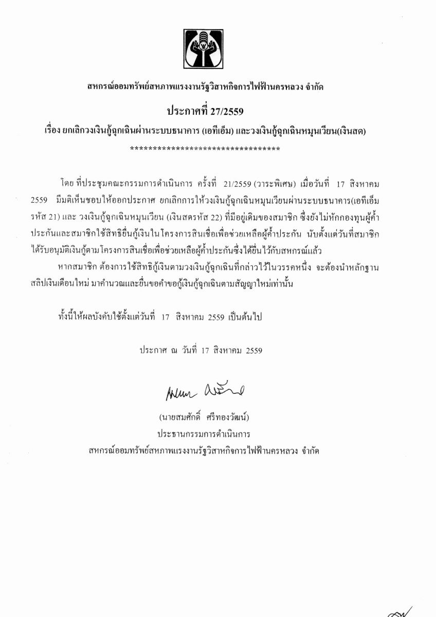 • ประกาศที่ 27/2559 เรื่อง ยกเลิกวงเงินกู้ฉุกเฉินผ่านระบบธนาคาร (เอทีเอ็ม) และฯ