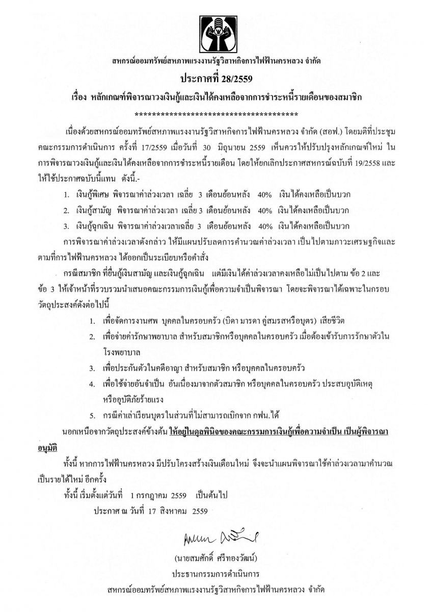 • ประกาศที่ 28/2559 เรื่องหลักเกณฑ์การพิจารณาวงเงินกู้และเงินได้คงเหลือจากการชำระหนี้รายเดือนของสมาชิก