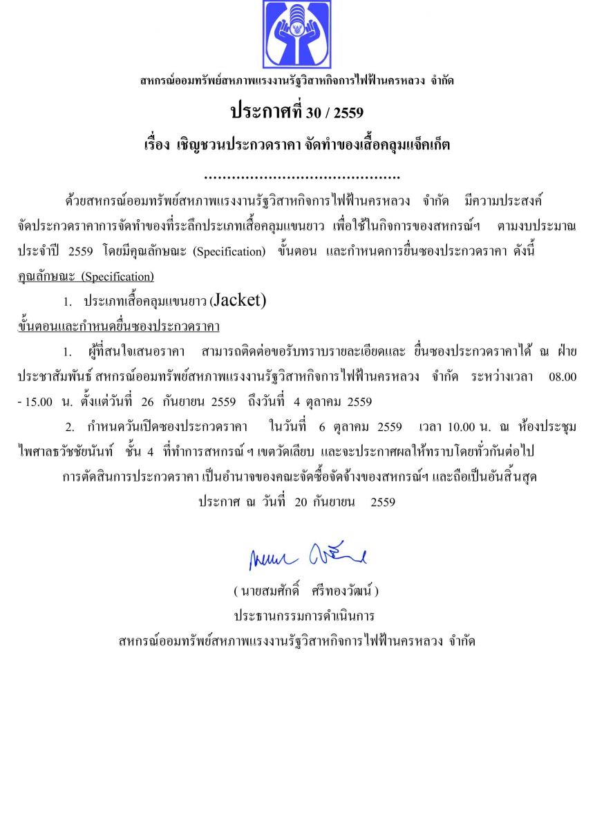 • ประกาศที่ 30/2559 เรื่อง เชิญชวนประกวดราคา จัดทำเสื้อคลุมเจ็คเก็ต