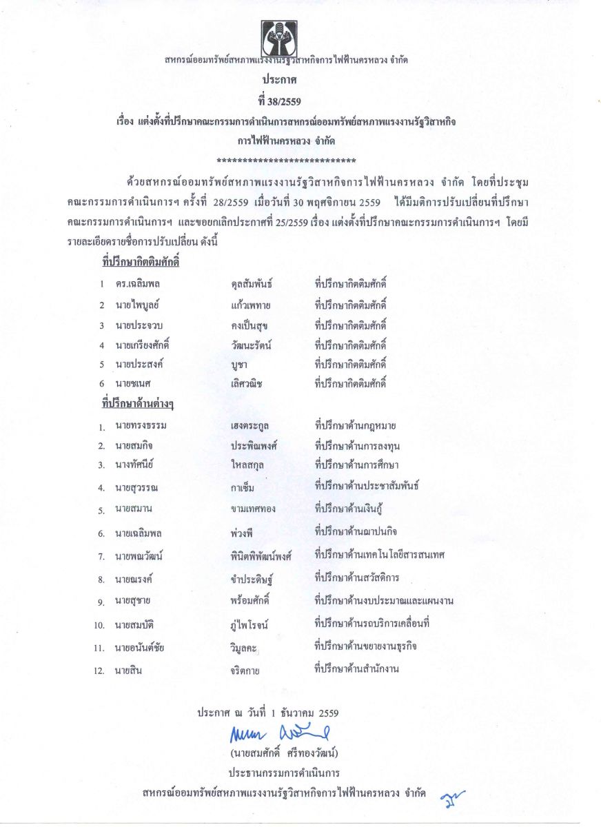• ประกาศที่ 38/2559 เรื่อง แต่งตั้งที่ปรึกษาคณะกรรมการดำเนินการสหกรณ์ออมทรัพย์ฯ