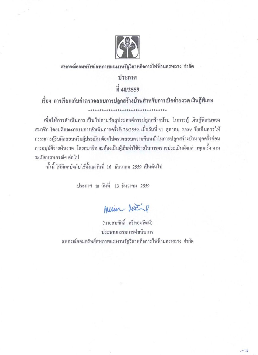 • ประกาศที่ 40/2559 เรื่อง การเรียกเก็บค่าตรวจสอบการปลูกสร้างบ้านสำหรับการเบิกจ่ายงวด เงินกู้พิเศษ