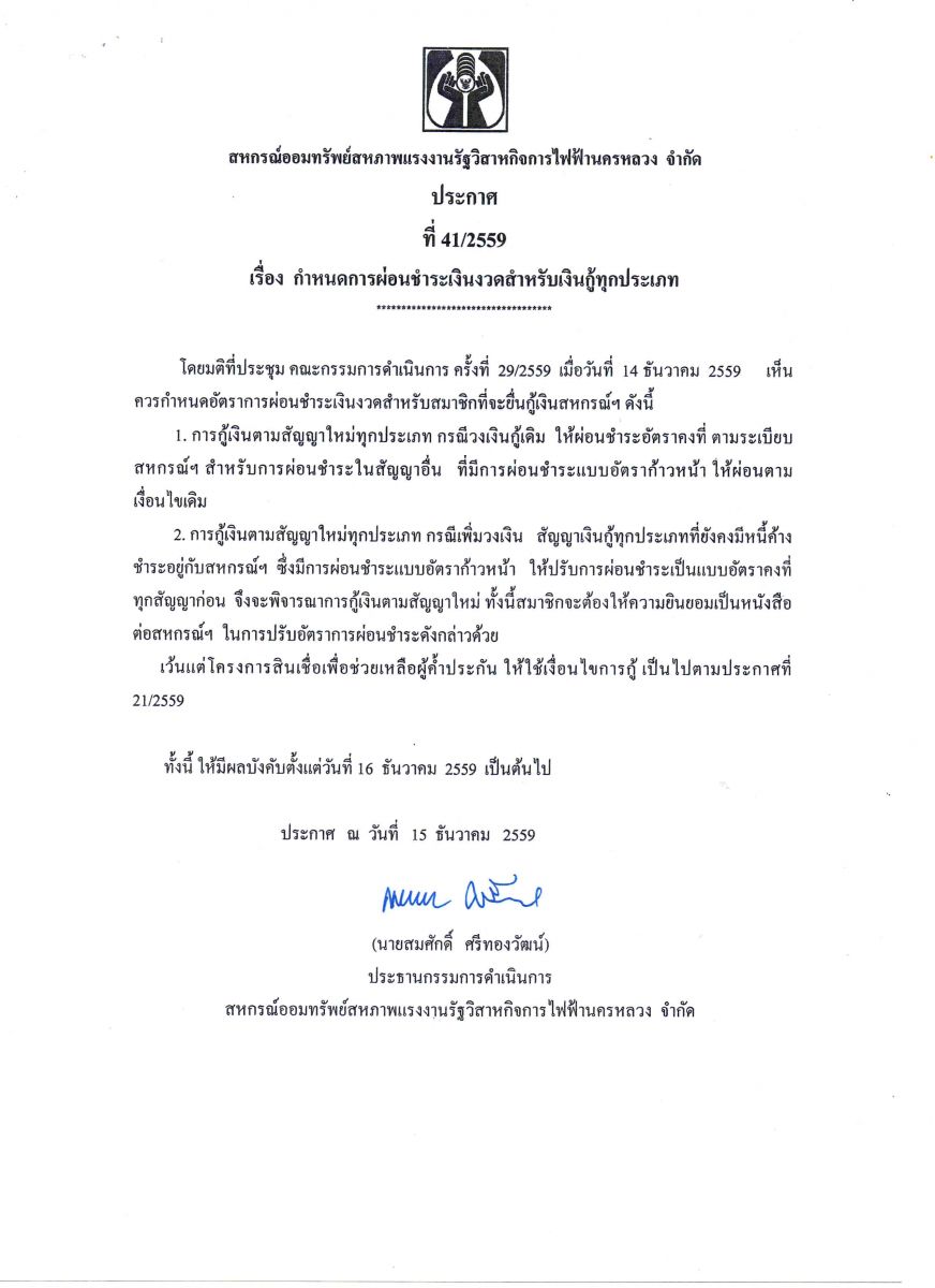 • ประกาศที่ 41/2559 เรื่อง กำหนดการผ่อนชำระเงินงวดสำหรับเงินกู้ทุกประเภท