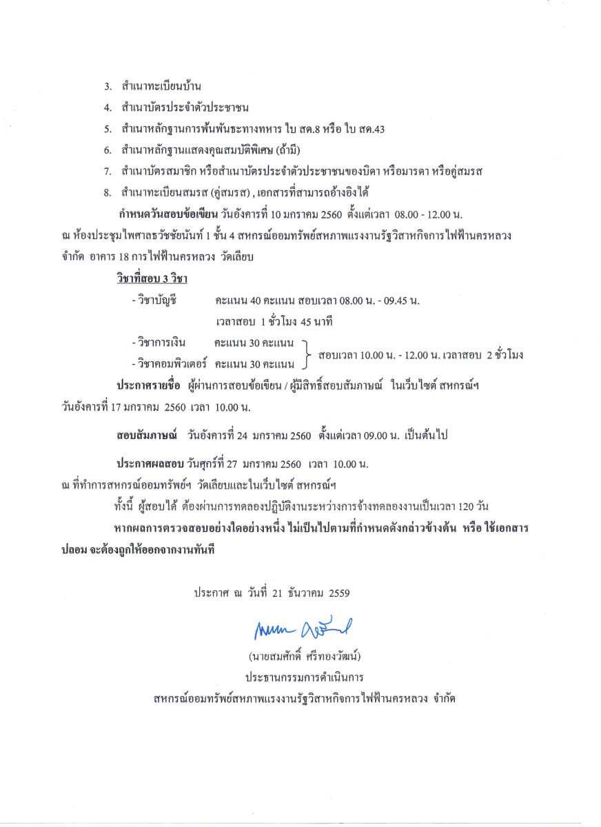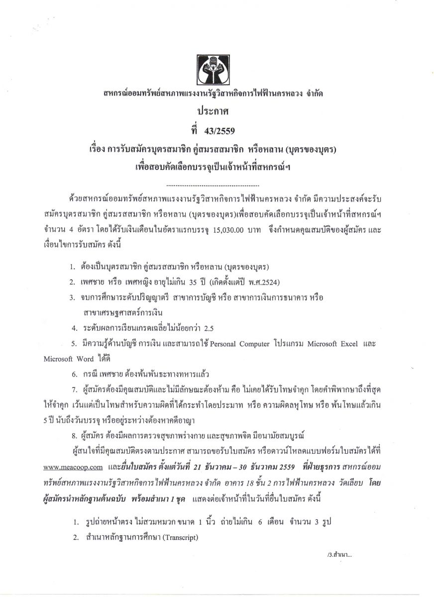• ประกาศที่ 43/2559 เรื่อง การรับบุตรสมาชิก คู่สมรสสมาชิก หรือหลาน (บุตรของบุตร) เพื่อสอบคัดเลือกฯ