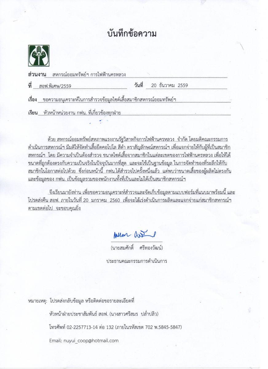ประกาศ เรื่อง ขอความอนุเคราะห์ในการสำรวจไซด์เสื้อสมาชิกสหกรณ์