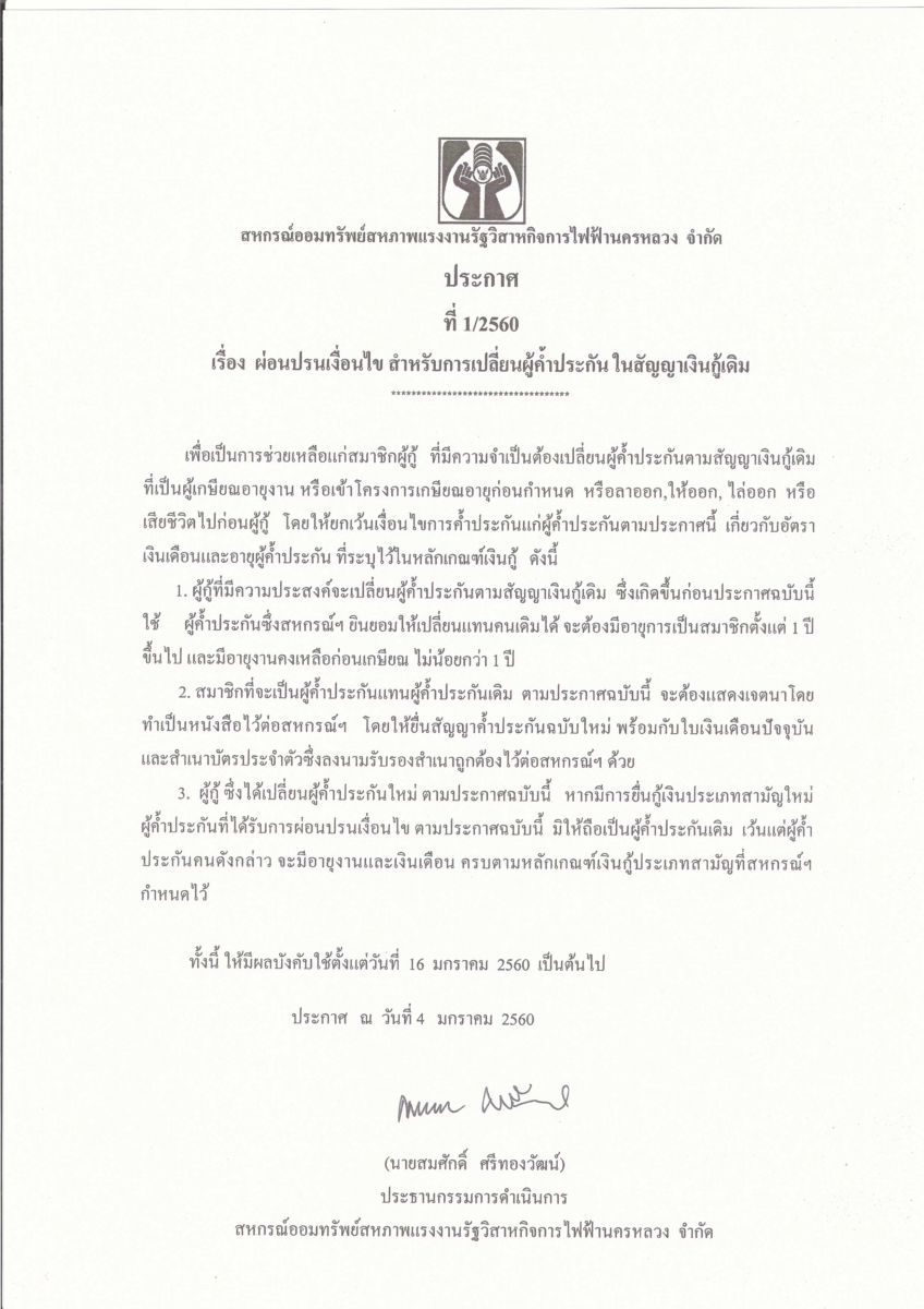 • ประกาศที่ 1/2560 เรื่อง ผ่อนปรนเงื่อนไข สำหรับการเปลี่ยนผู้ค้ำประกัน ในสัญญาเงินกู้เดิม