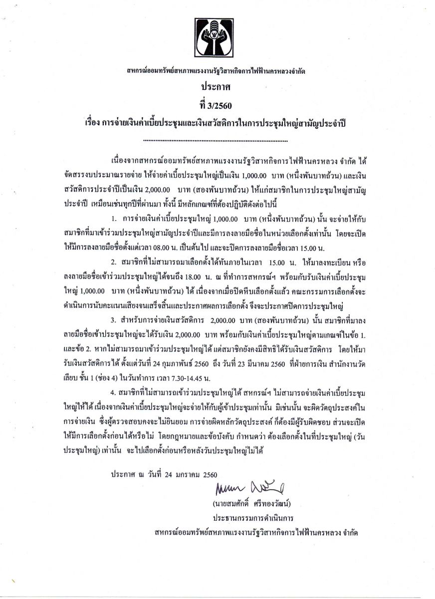• ประกาศที่ 3/2560 เรื่อง การจ่ายเงินค่าเบี้ยประชุมและเงินสวัสดิการในการประชุมใหญ่สามัญประจำปี