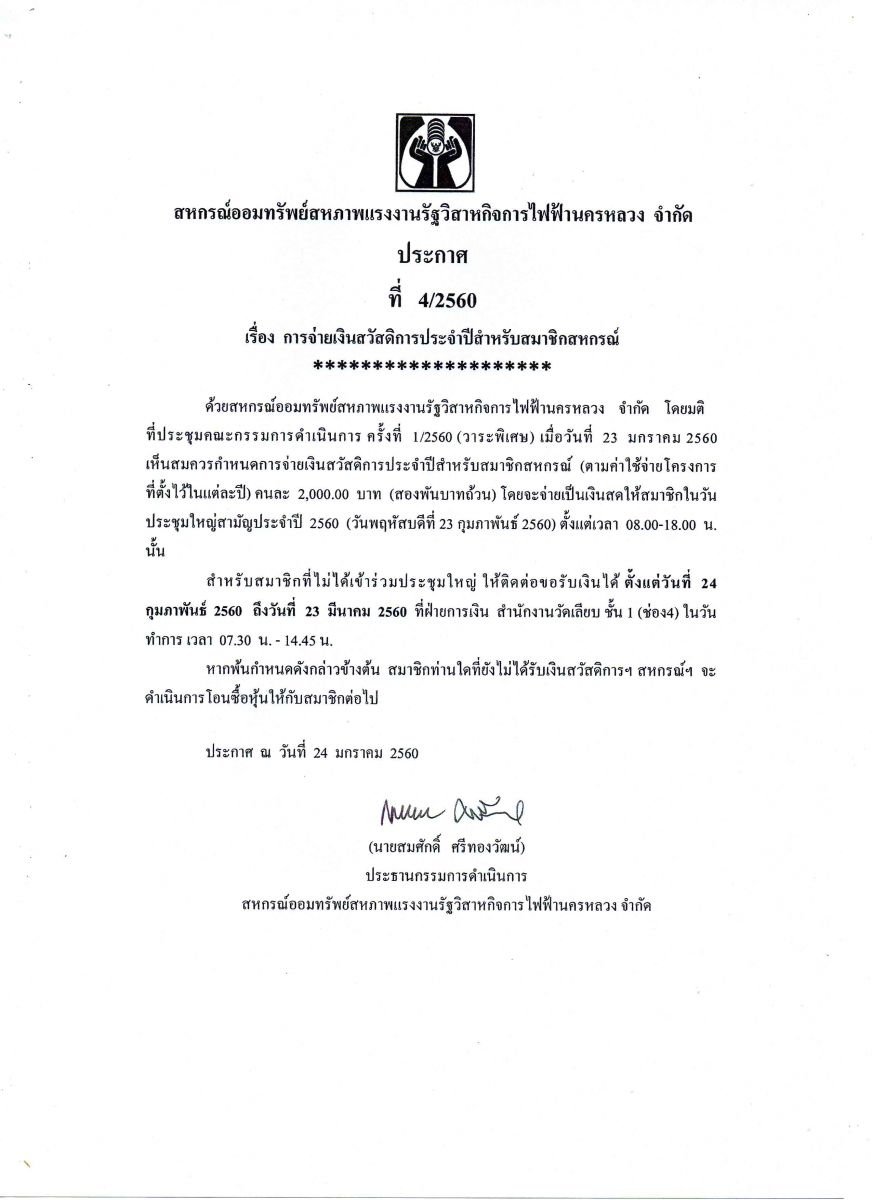 • ประกาศที่ 4/2560 เรื่อง การจ่ายเงินสวัสดิการประจำปีสำหรับสมาชิกสหกรณ์