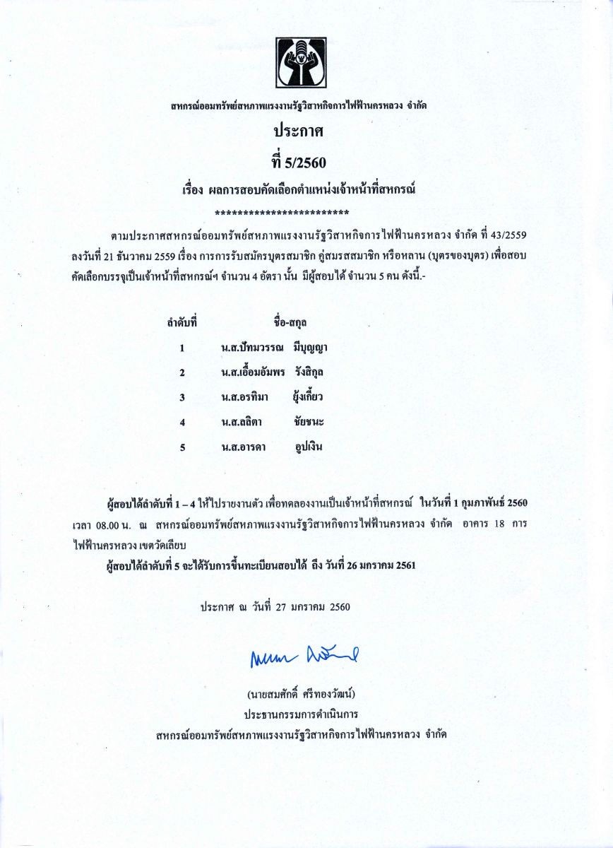 • ประกาศที่ 5/2560 เรื่อง ผลการสอบคัดเลือกตำแหน่งเจ้าหน้าที่