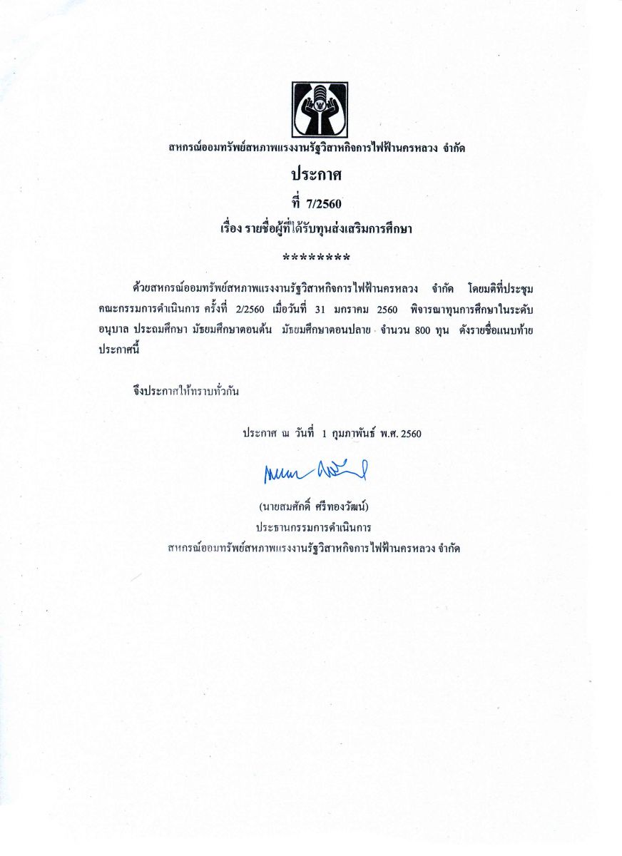 • ประกาศที่ 7/2560 เรื่อง รายชื่อผู้ที่ได้รับทุนส่งเสริมการศึกษา