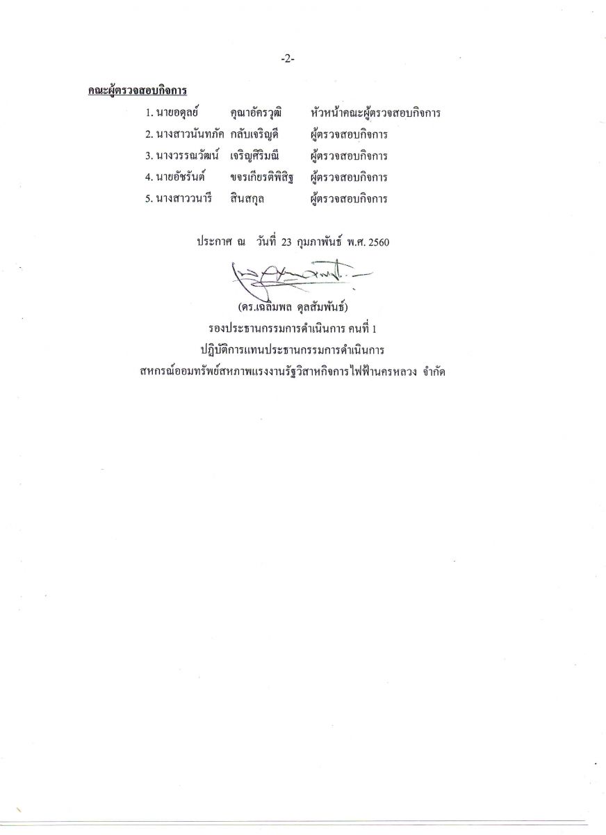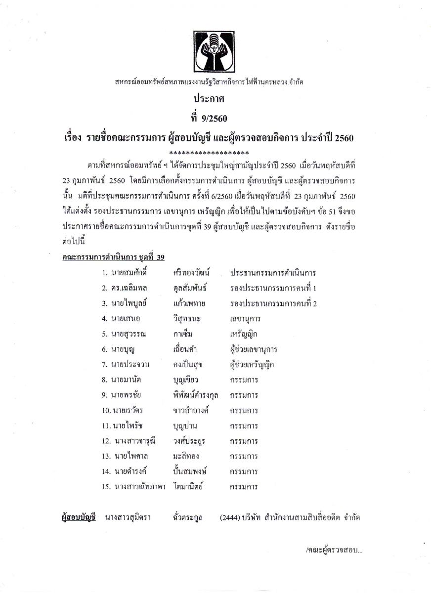 • ประกาศที่ 9/2560 เรื่อง รายชื่อคณะกรรมการ ผู้สอบบัญชี และผู้ตรวจสอบกิจการ ประจำปี 2560