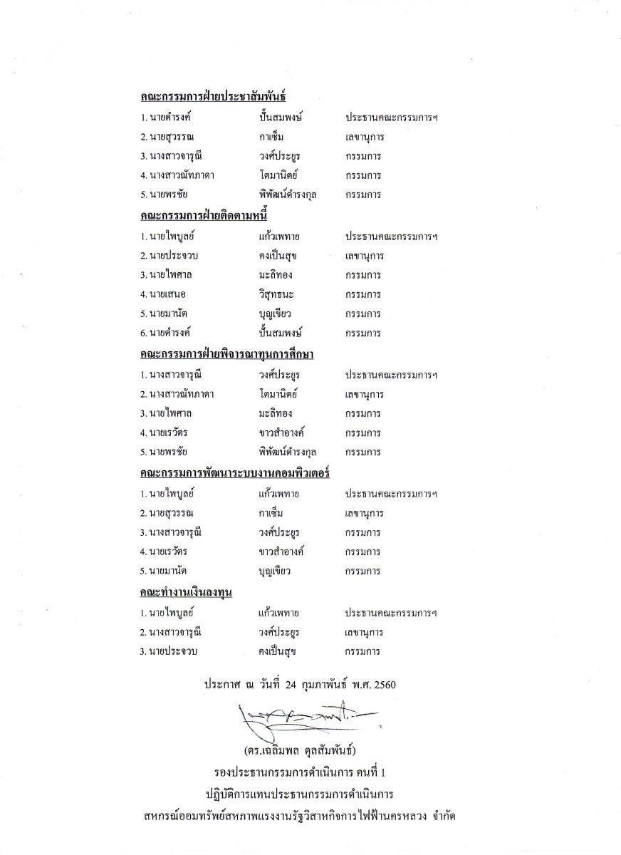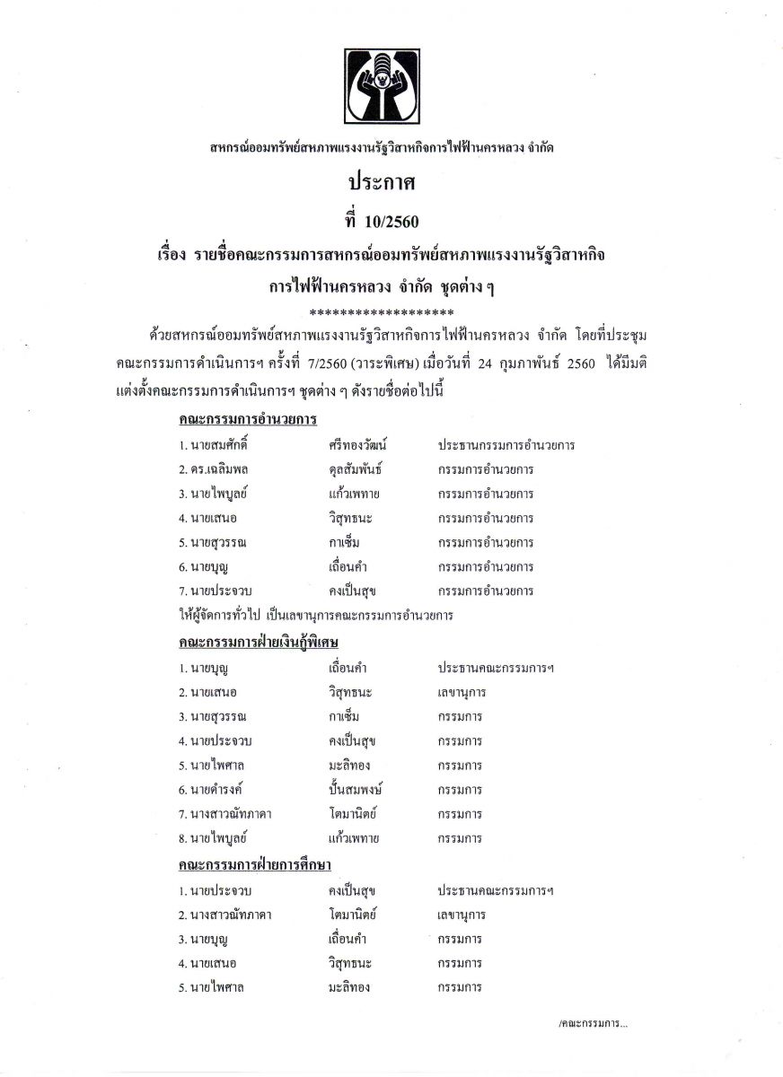 • ประกาศที่ 10/2560 เรื่อง รายชื่อคณะกรรมการสหกรณ์ออมทรัพย์ฯ ชุดต่าง ๆ
