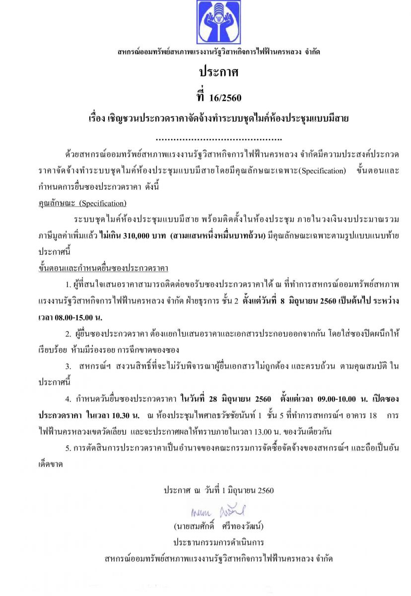 • ประกาศที่ 16/2560 เรื่อง เชิญชวนประกวดราคาจัดจ้างทำระบบชุดไมค์ห้องประชุมแบบมีสาย
